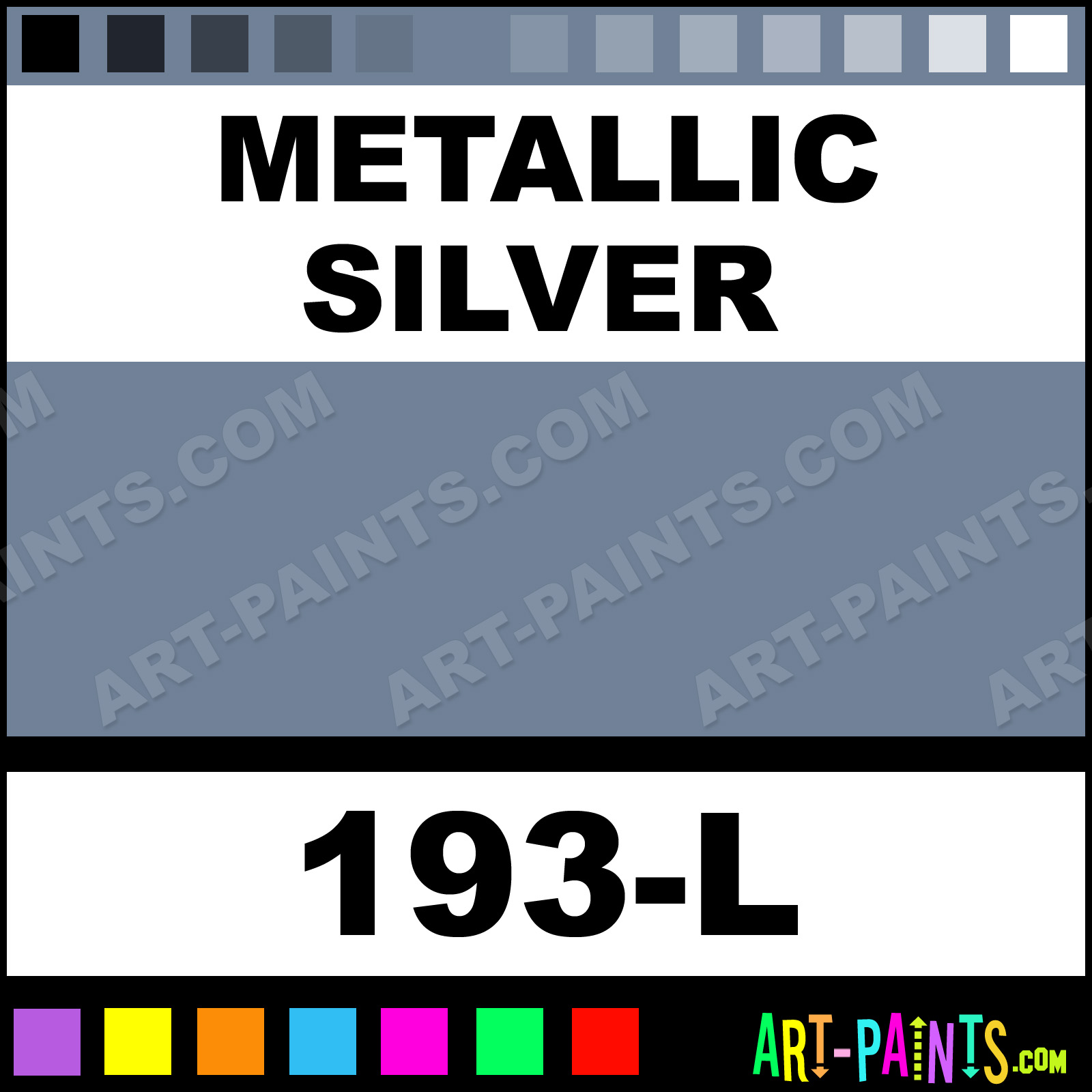 This beautiful Striping and Lettering Airbrush shade is called Metallic Silver, and comes from a company called 1 Shot. Their product number, along with the HTML color code, RGB, and CMYK codes are listed below. This Beautiful Shade of Metallic Silver and others can be found in the 1 Shot Striping and Lettering Art Spray Paint Gallery! Also be sure to browse through the other wonderful Professional Color Galleries to see more of 1 Shot Striping and Lettering Airbrush Brand Spray Paints and other Spray Paint Manufacturers. And as always, Paint Paint Paint!   -Art-Paints.com