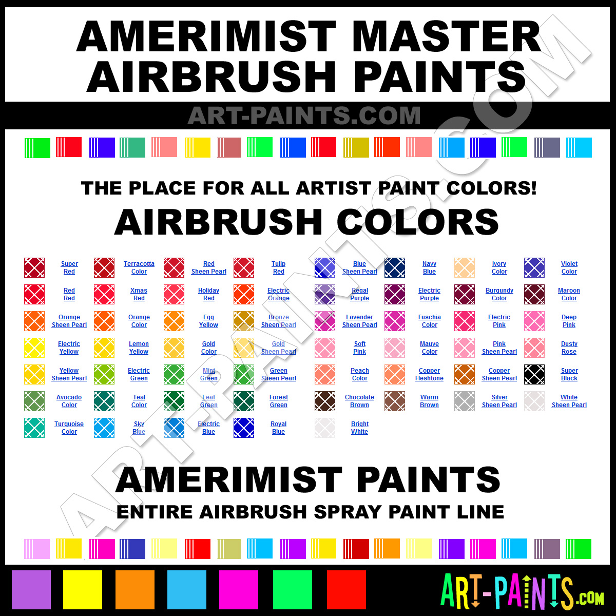 AmeriMist knows Airbrush Spray Paints! They make a wonderful brand of paint called AmeriMist Master Airbrush Colors that suits all types of artists. They strive to perfect the process of color and are one of the most popular Airbrush Spray Paint Brand companies in the world. Enjoy their entire paint brand collection from the list below. AmeriMist makes wonderful Artists Paints that everyone is sure to enjoy! Choose an Airbrush Spray Paint Color below to view that Hue and all their great related Paint Colors. Paint on!     -Art-Paints.com