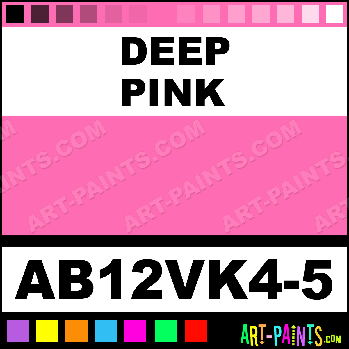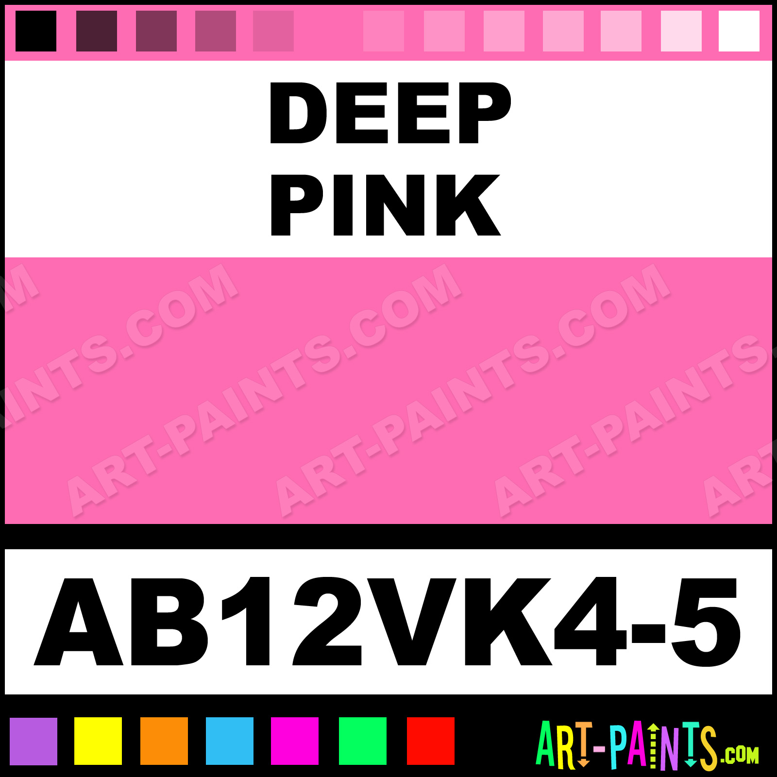 This beautiful Starter Kit 12 Airbrush shade is called Deep Pink, and comes from a company called AmeriMist. Their product number, along with the HTML color code, RGB, and CMYK codes are listed below. This Beautiful Shade of Deep Pink and others can be found in the AmeriMist Starter Kit 12 Art Spray Paint Gallery! Also be sure to browse through the other wonderful Professional Color Galleries to see more of AmeriMist Starter Kit 12 Airbrush Brand Spray Paints and other Spray Paint Manufacturers. And as always, Paint Paint Paint!   -Art-Paints.com