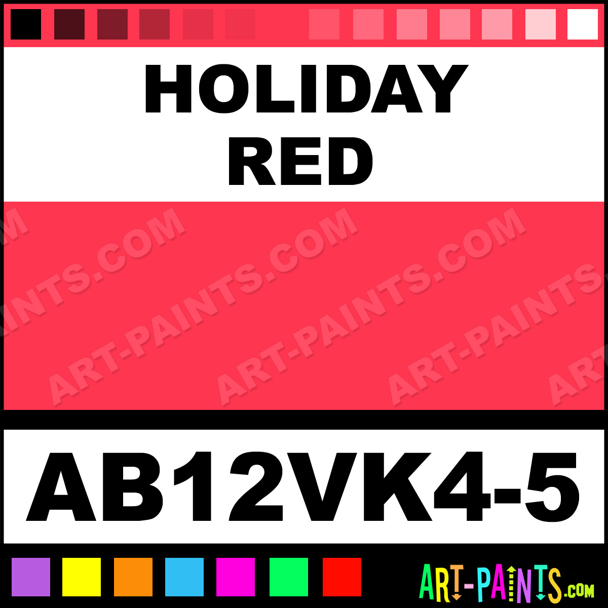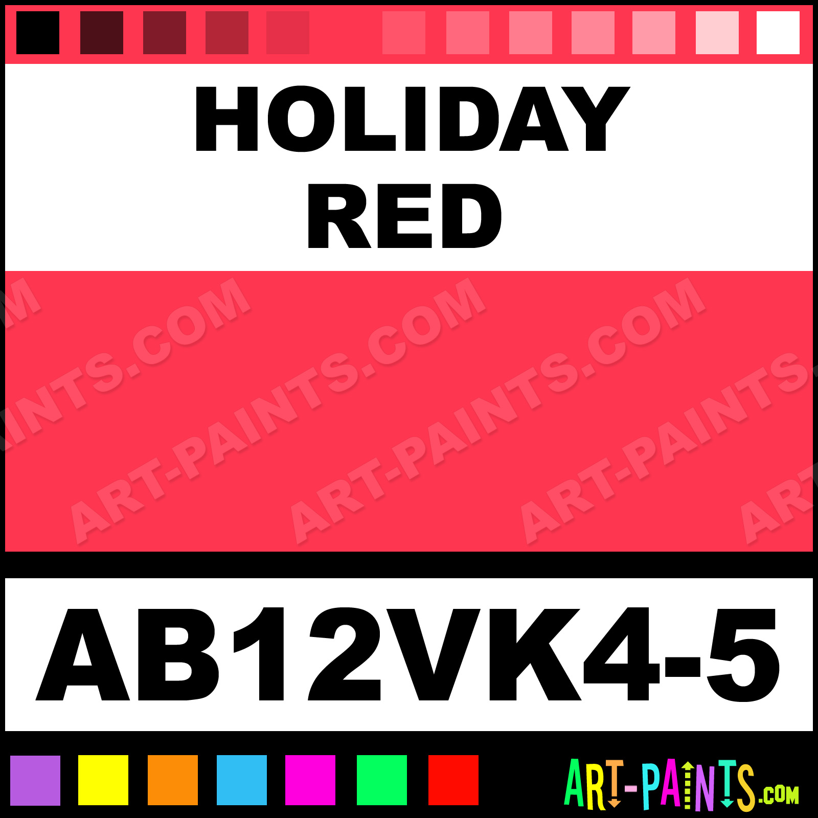 This beautiful Starter Kit 12 Airbrush shade is called Holiday Red, and comes from a company called AmeriMist. Their product number, along with the HTML color code, RGB, and CMYK codes are listed below. This Beautiful Shade of Holiday Red and others can be found in the AmeriMist Starter Kit 12 Art Spray Paint Gallery! Also be sure to browse through the other wonderful Professional Color Galleries to see more of AmeriMist Starter Kit 12 Airbrush Brand Spray Paints and other Spray Paint Manufacturers. And as always, Paint Paint Paint!   -Art-Paints.com