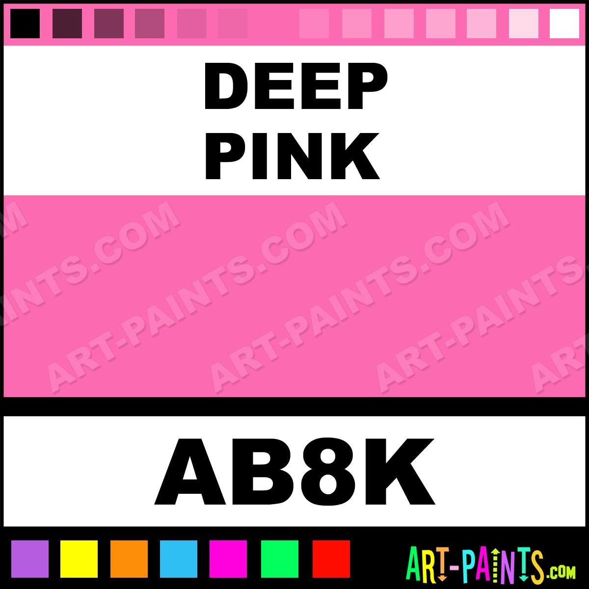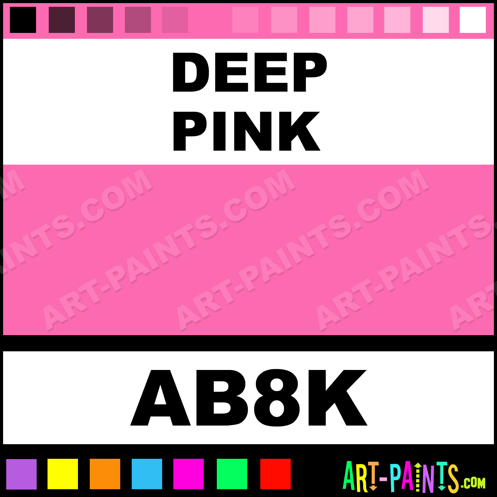 This beautiful Starter Kit 8 Airbrush shade is called Deep Pink, and comes from a company called AmeriMist. Their product number, along with the HTML color code, RGB, and CMYK codes are listed below. This Beautiful Shade of Deep Pink and others can be found in the AmeriMist Starter Kit 8 Art Spray Paint Gallery! Also be sure to browse through the other wonderful Professional Color Galleries to see more of AmeriMist Starter Kit 8 Airbrush Brand Spray Paints and other Spray Paint Manufacturers. And as always, Paint Paint Paint!   -Art-Paints.com