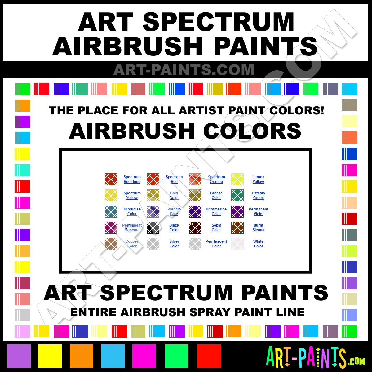 Art Spectrum makes beautiful Airbrush Spray Paint Brands. With a complete line of Concentrated Ink Airbrush Paints and Pigmented Inks Airbrush Paint Lines, 33 colors in all, available in just about every hue and color, they will no doubt keep you painting and smiling at the same time. Each Brand is unique and the variety of Spray Paints is exquisite!