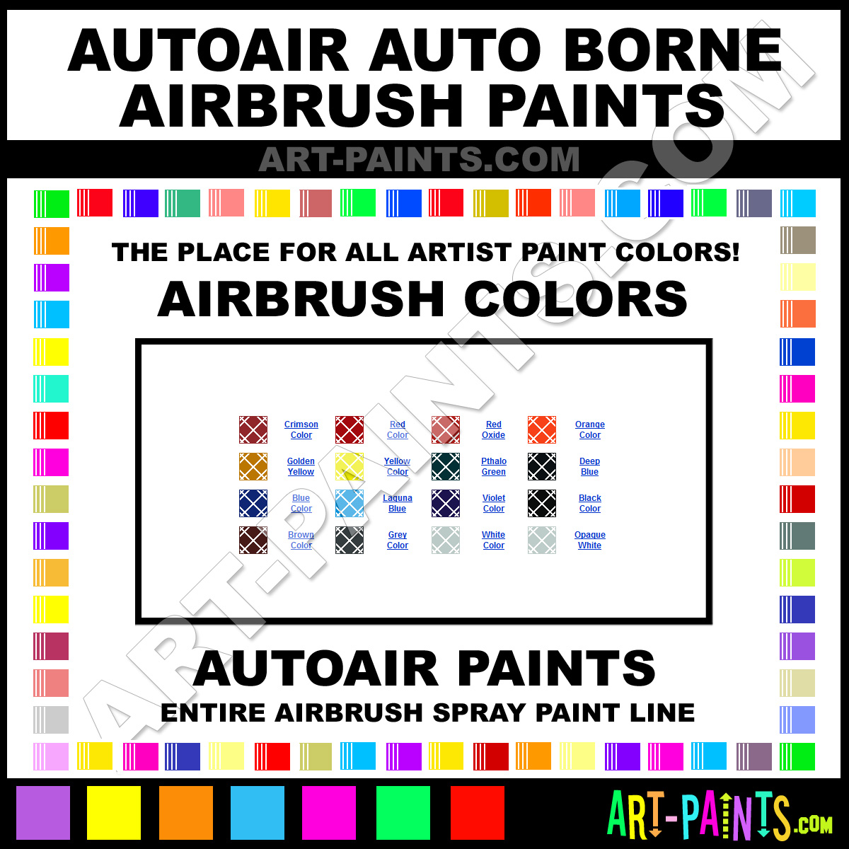 AutoAir knows Airbrush Spray Paints! They make a wonderful brand of paint called AutoAir Auto Borne Airbrush Colors that suits all types of artists. They strive to perfect the process of color and are one of the most popular Airbrush Spray Paint Brand companies in the world. Enjoy their entire paint brand collection from the list below. AutoAir makes wonderful Artists Paints that everyone is sure to enjoy! Choose an Airbrush Spray Paint Color below to view that Hue and all their great related Paint Colors. Paint on!     -Art-Paints.com