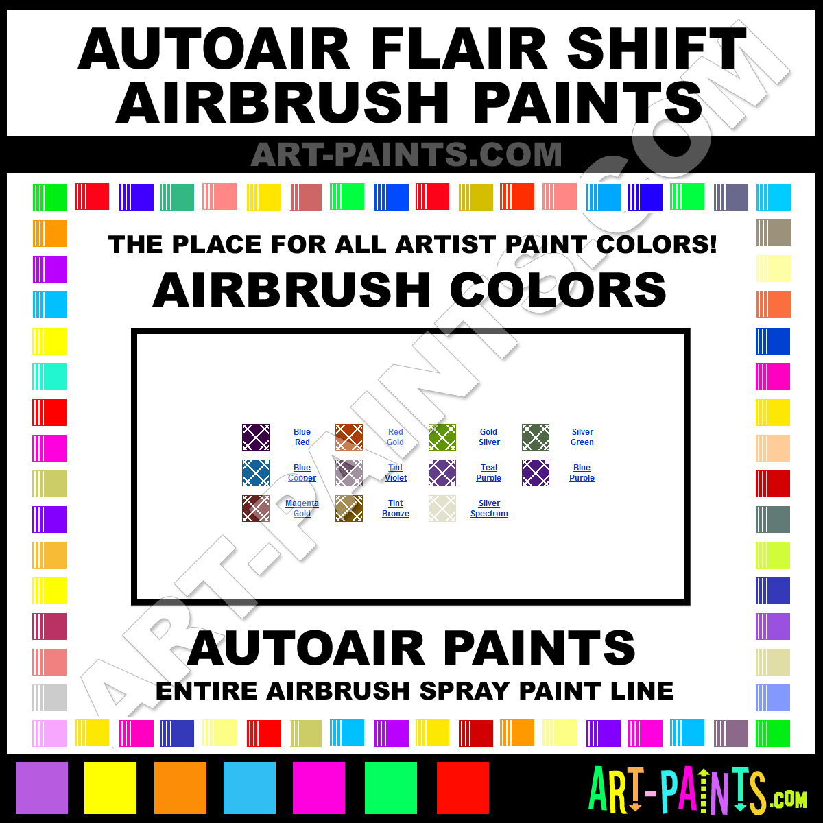 AutoAir knows Airbrush Spray Paints! They make a wonderful brand of paint called AutoAir Flair Shift Airbrush Colors that suits all types of artists. They strive to perfect the process of color and are one of the most popular Airbrush Spray Paint Brand companies in the world. Enjoy their entire paint brand collection from the list below. AutoAir makes wonderful Artists Paints that everyone is sure to enjoy! Choose an Airbrush Spray Paint Color below to view that Hue and all their great related Paint Colors. Paint on!     -Art-Paints.com