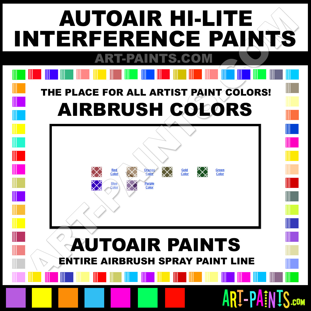 AutoAir makes a beautiful Hi-Lite Interference Spray Paint Brand. With a complete line of Airbrush Color Spray Paints, 6 colors in all, available in beautiful hues and colors, they will no doubt keep you painting and smiling at the same time. This brand is very unique and exquisite!