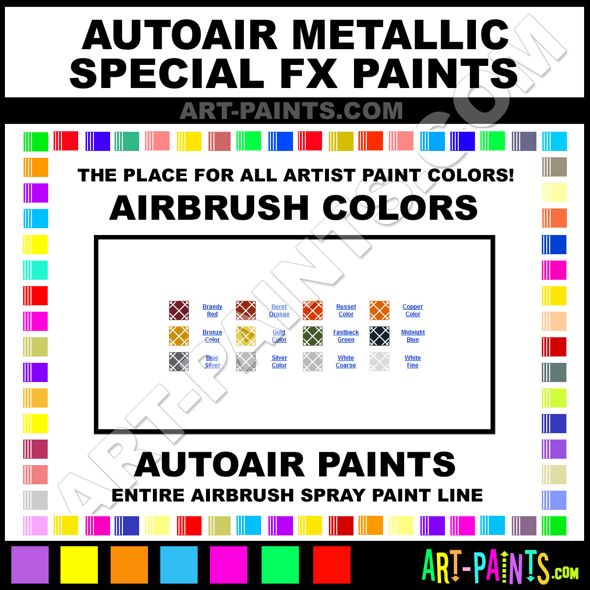 AutoAir makes a beautiful Metallic Special FX Spray Paint Brand. With a complete line of Airbrush Color Spray Paints, 12 colors in all, available in beautiful hues and colors, they will no doubt keep you painting and smiling at the same time. This brand is very unique and exquisite!