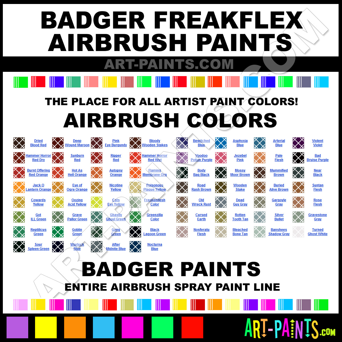 Badger makes a beautiful FreakFlex Spray Paint Brand. With a complete line of Airbrush Color Spray Paints, 60 colors in all, available in beautiful hues and colors, they will no doubt keep you painting and smiling at the same time. This brand is very unique and exquisite!