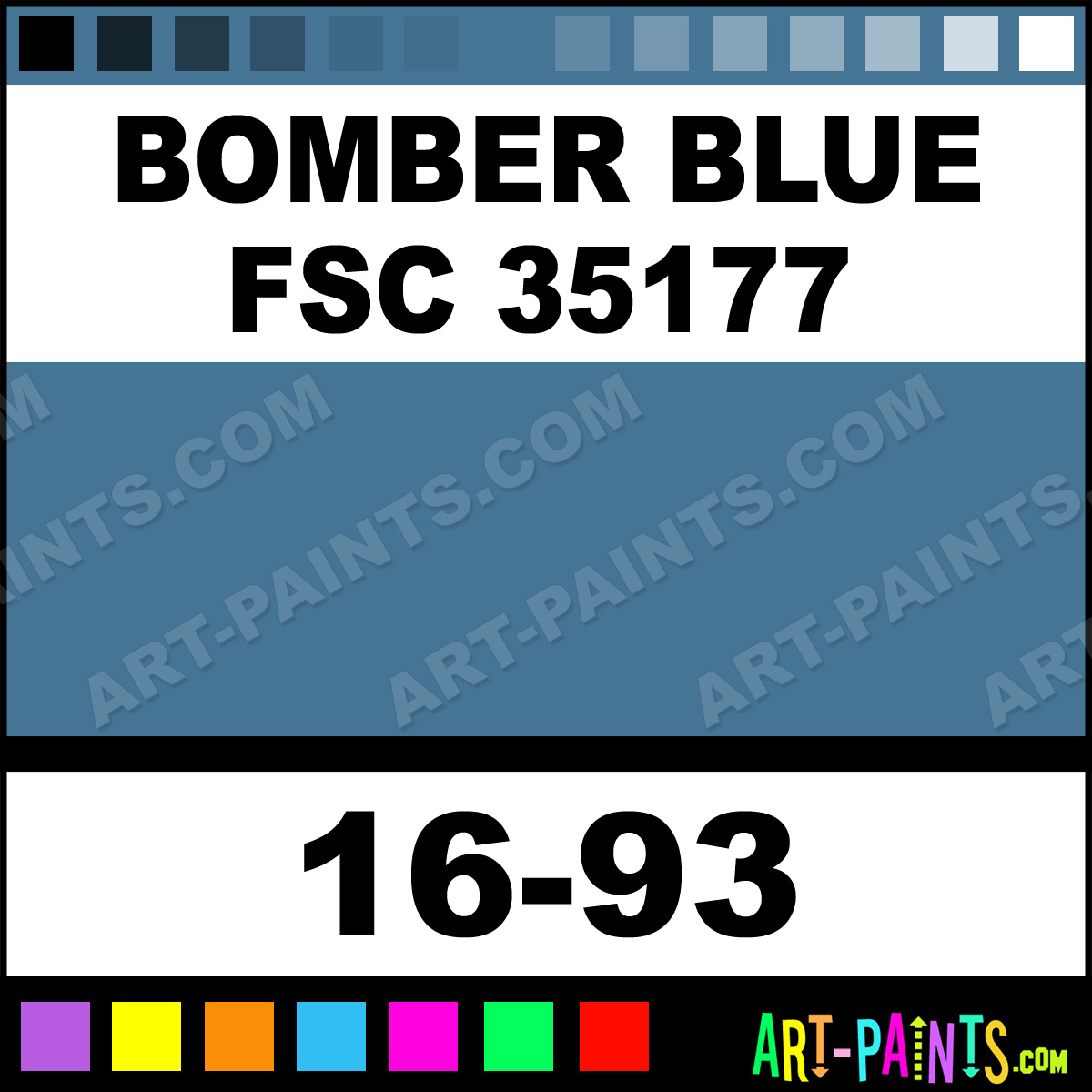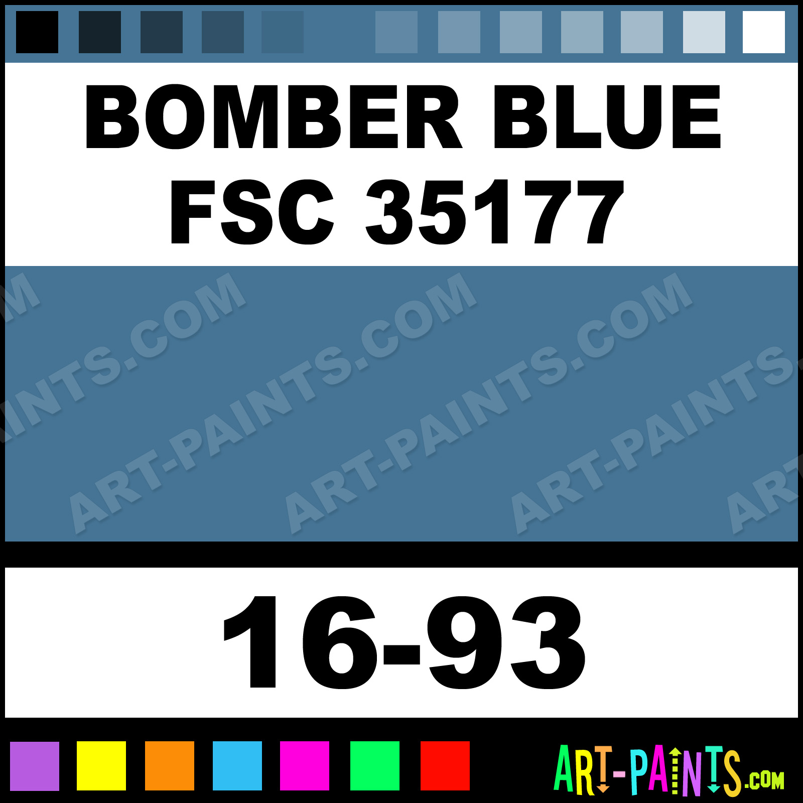 This beautiful ModelFlex Military Airbrush shade is called Bomber Blue FSC 35177, and comes from a company called Badger. Their product number, along with the HTML color code, RGB, and CMYK codes are listed below. This Beautiful Shade of Bomber Blue FSC 35177 and others can be found in the Badger ModelFlex Military Art Spray Paint Gallery! Also be sure to browse through the other wonderful Professional Color Galleries to see more of Badger ModelFlex Military Airbrush Brand Spray Paints and other Spray Paint Manufacturers. And as always, Paint Paint Paint!   -Art-Paints.com