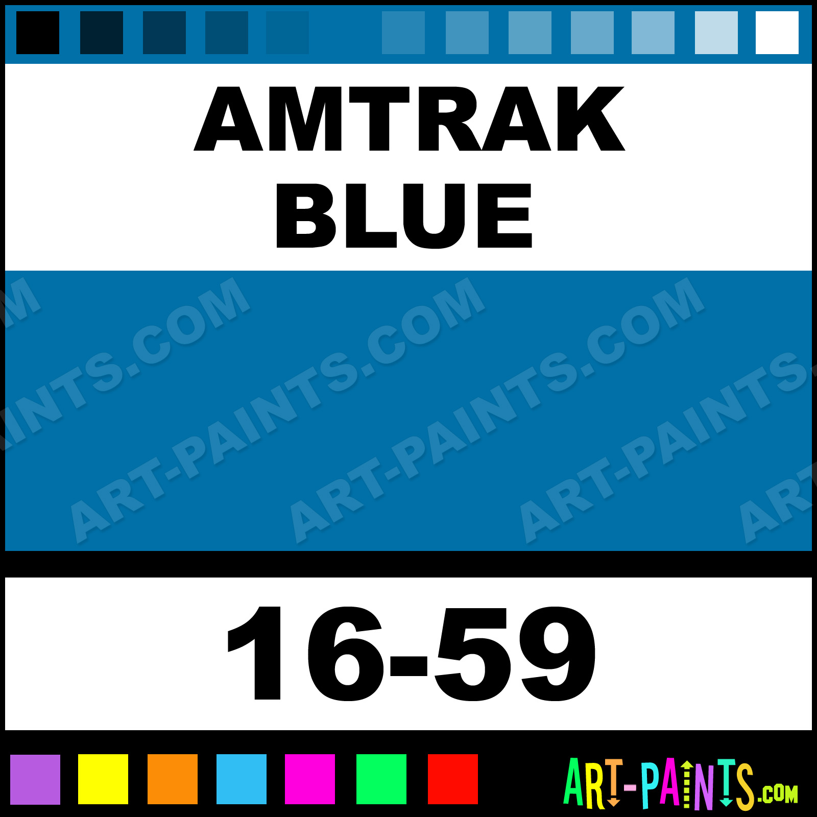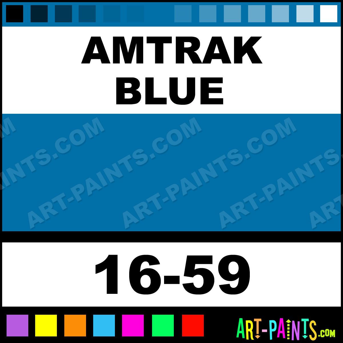 This beautiful ModelFlex Railroad Airbrush shade is called Amtrak Blue, and comes from a company called Badger. Their product number, along with the HTML color code, RGB, and CMYK codes are listed below. This Beautiful Shade of Amtrak Blue and others can be found in the Badger ModelFlex Railroad Art Spray Paint Gallery! Also be sure to browse through the other wonderful Professional Color Galleries to see more of Badger ModelFlex Railroad Airbrush Brand Spray Paints and other Spray Paint Manufacturers. And as always, Paint Paint Paint!   -Art-Paints.com