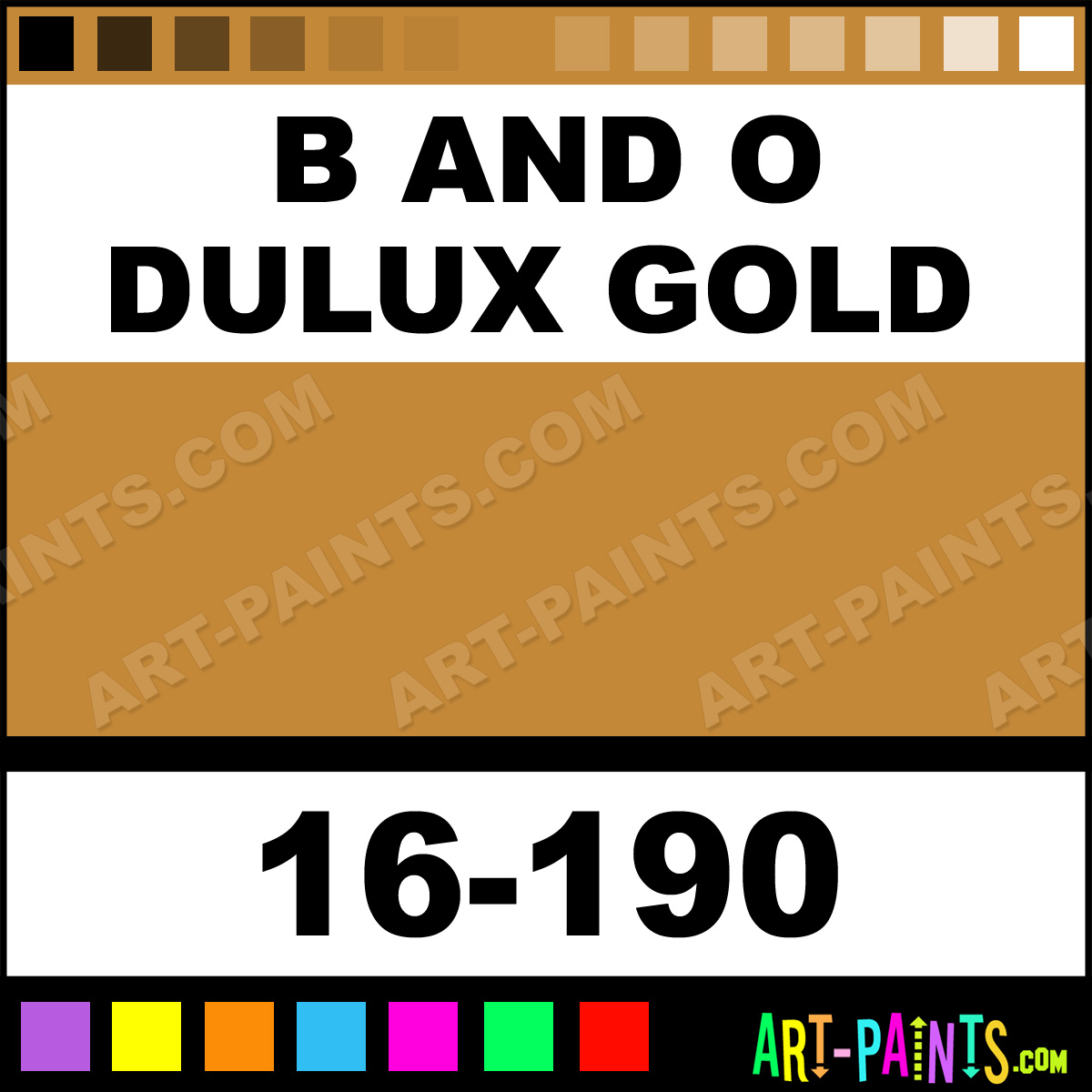 This beautiful ModelFlex Railroad Airbrush shade is called B and O Dulux Gold, and comes from a company called Badger. Their product number, along with the HTML color code, RGB, and CMYK codes are listed below. This Beautiful Shade of B and O Dulux Gold and others can be found in the Badger ModelFlex Railroad Art Spray Paint Gallery! Also be sure to browse through the other wonderful Professional Color Galleries to see more of Badger ModelFlex Railroad Airbrush Brand Spray Paints and other Spray Paint Manufacturers. And as always, Paint Paint Paint!   -Art-Paints.com