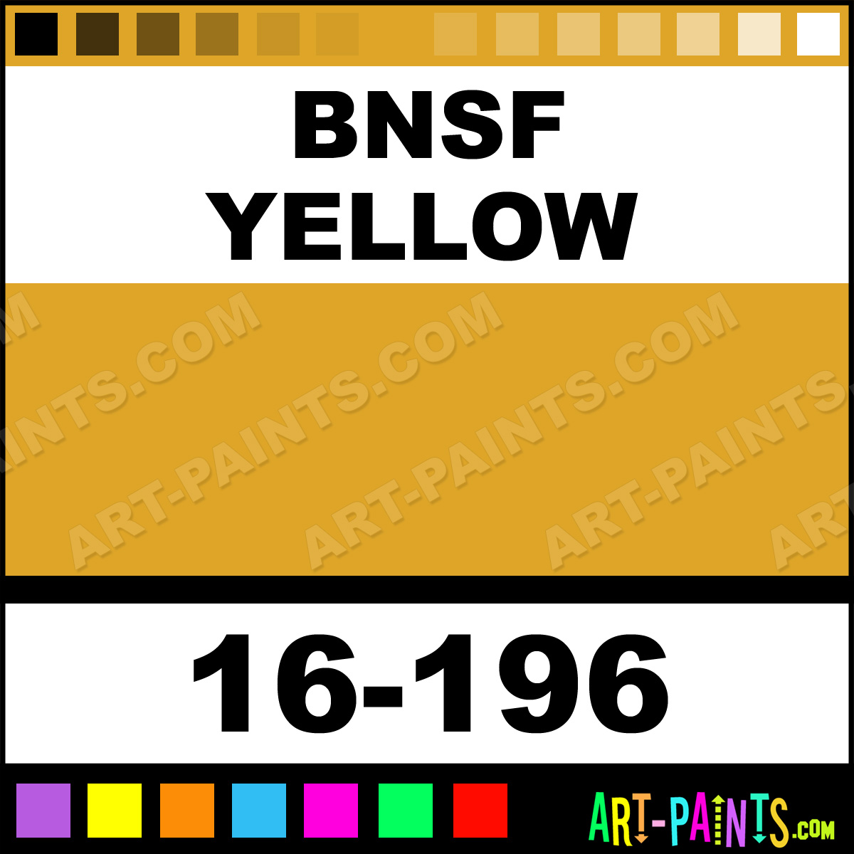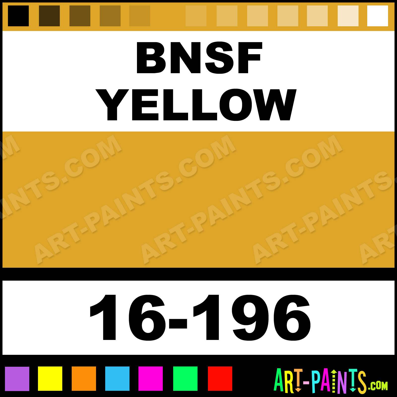 This beautiful ModelFlex Railroad Airbrush shade is called BNSF Yellow, and comes from a company called Badger. Their product number, along with the HTML color code, RGB, and CMYK codes are listed below. This Beautiful Shade of BNSF Yellow and others can be found in the Badger ModelFlex Railroad Art Spray Paint Gallery! Also be sure to browse through the other wonderful Professional Color Galleries to see more of Badger ModelFlex Railroad Airbrush Brand Spray Paints and other Spray Paint Manufacturers. And as always, Paint Paint Paint!   -Art-Paints.com