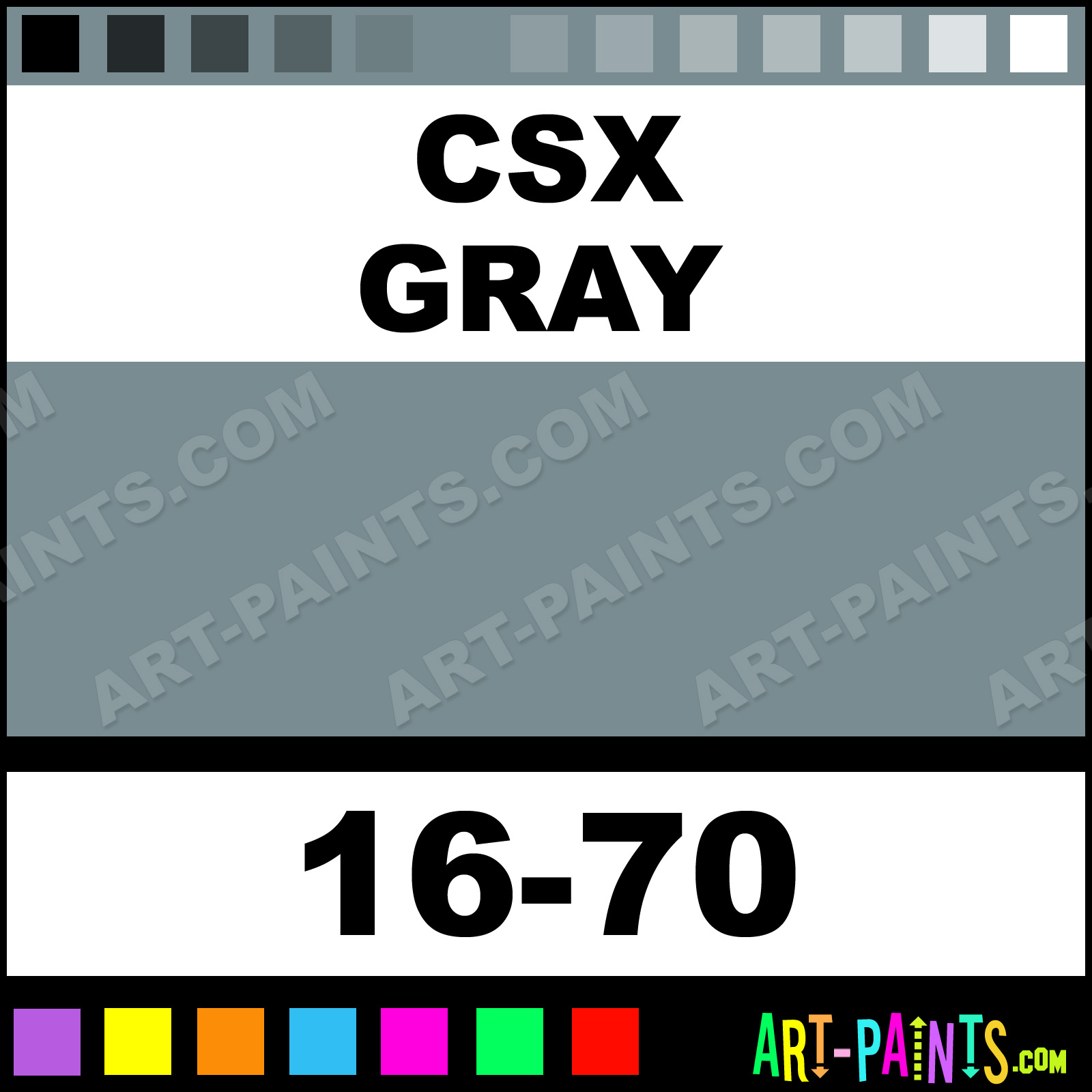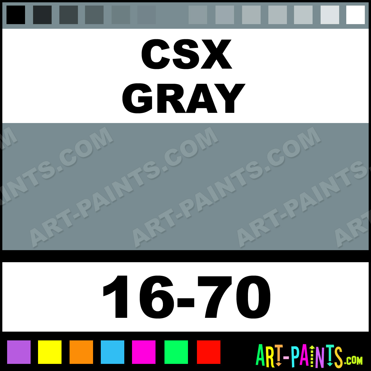 This beautiful ModelFlex Railroad Airbrush shade is called CSX Gray, and comes from a company called Badger. Their product number, along with the HTML color code, RGB, and CMYK codes are listed below. This Beautiful Shade of CSX Gray and others can be found in the Badger ModelFlex Railroad Art Spray Paint Gallery! Also be sure to browse through the other wonderful Professional Color Galleries to see more of Badger ModelFlex Railroad Airbrush Brand Spray Paints and other Spray Paint Manufacturers. And as always, Paint Paint Paint!   -Art-Paints.com