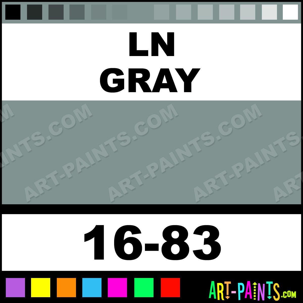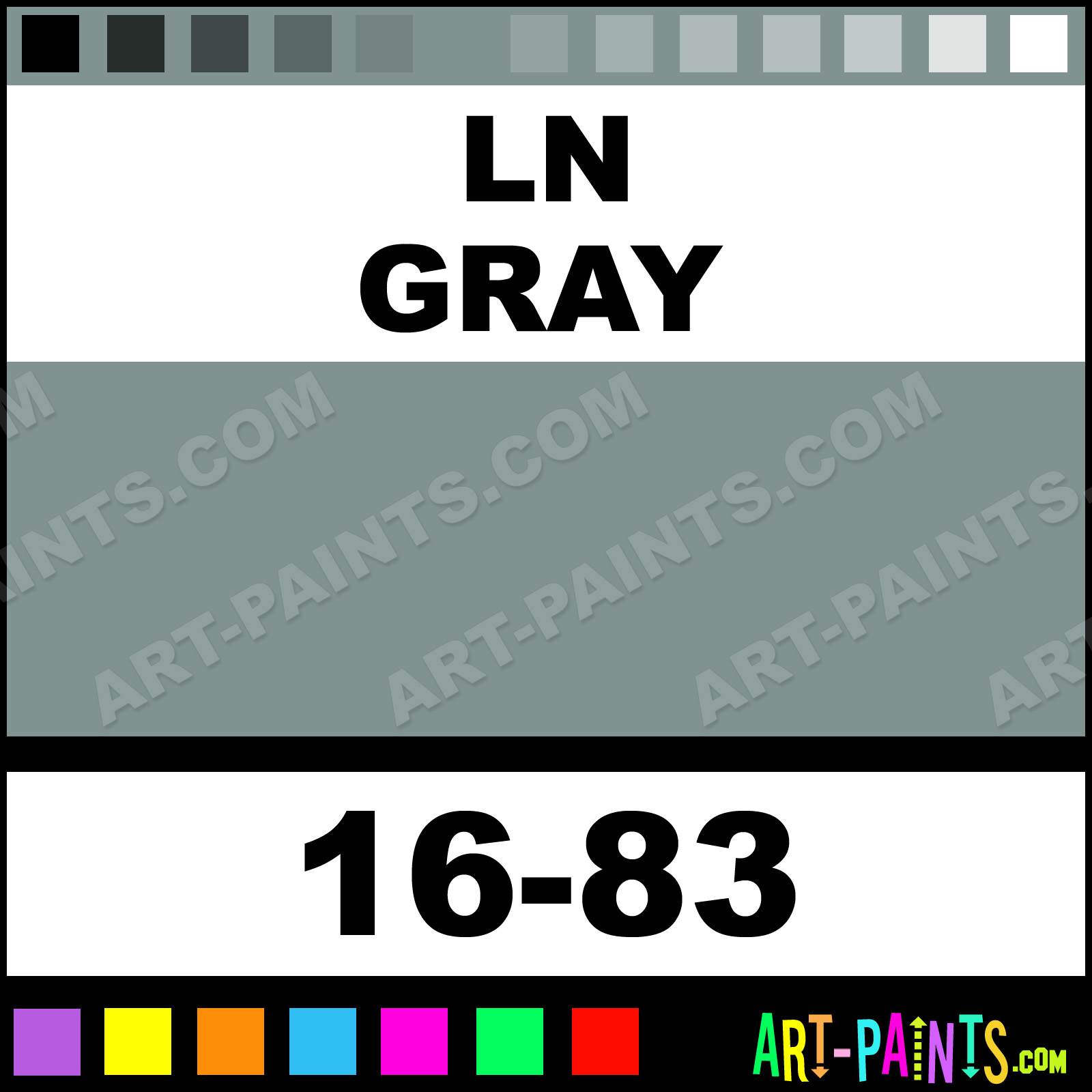 This beautiful ModelFlex Railroad Airbrush shade is called LN Gray, and comes from a company called Badger. Their product number, along with the HTML color code, RGB, and CMYK codes are listed below. This Beautiful Shade of LN Gray and others can be found in the Badger ModelFlex Railroad Art Spray Paint Gallery! Also be sure to browse through the other wonderful Professional Color Galleries to see more of Badger ModelFlex Railroad Airbrush Brand Spray Paints and other Spray Paint Manufacturers. And as always, Paint Paint Paint!   -Art-Paints.com
