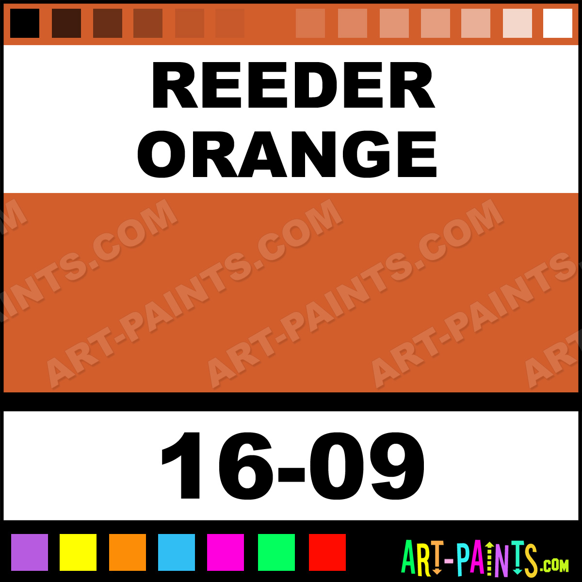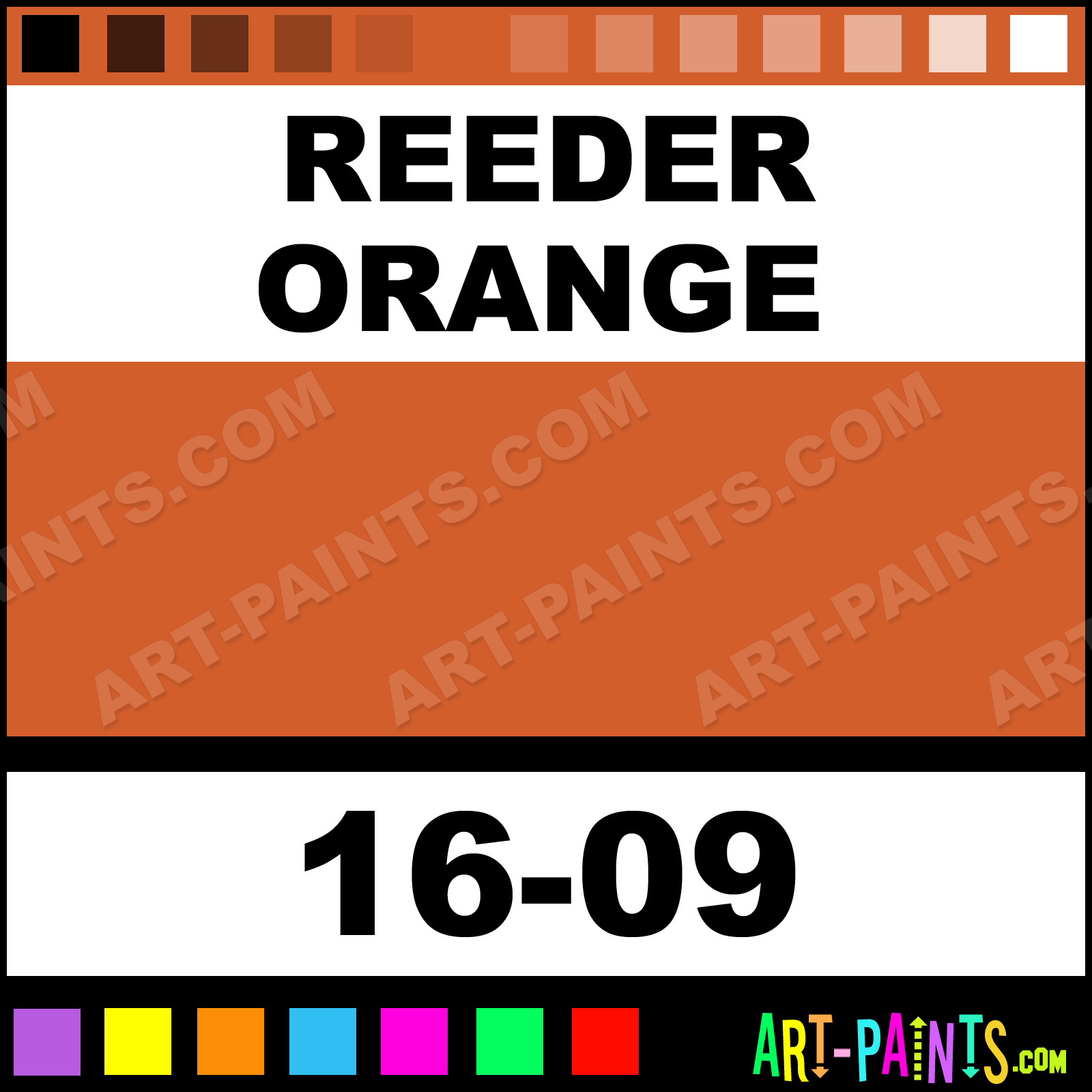 This beautiful ModelFlex Railroad Airbrush shade is called Reeder Orange, and comes from a company called Badger. Their product number, along with the HTML color code, RGB, and CMYK codes are listed below. This Beautiful Shade of Reeder Orange and others can be found in the Badger ModelFlex Railroad Art Spray Paint Gallery! Also be sure to browse through the other wonderful Professional Color Galleries to see more of Badger ModelFlex Railroad Airbrush Brand Spray Paints and other Spray Paint Manufacturers. And as always, Paint Paint Paint!   -Art-Paints.com