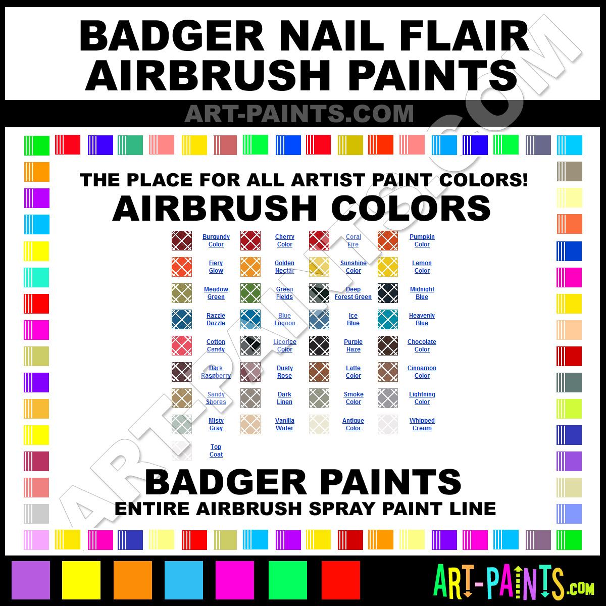Badger knows Airbrush Spray Paints! They make a wonderful brand of paint called Badger Nail Flair Airbrush Colors that suits all types of artists. They strive to perfect the process of color and are one of the most popular Airbrush Spray Paint Brand companies in the world. Enjoy their entire paint brand collection from the list below. Badger makes wonderful Artists Paints that everyone is sure to enjoy! Choose an Airbrush Spray Paint Color below to view that Hue and all their great related Paint Colors. Paint on!     -Art-Paints.com