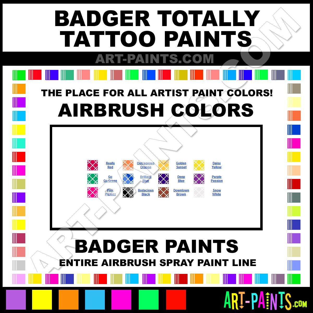 Badger knows Airbrush Spray Paints! They make a wonderful brand of paint called Badger Totally Tattoo Airbrush Colors that suits all types of artists. They strive to perfect the process of color and are one of the most popular Airbrush Spray Paint Brand companies in the world. Enjoy their entire paint brand collection from the list below. Badger makes wonderful Artists Paints that everyone is sure to enjoy! Choose an Airbrush Spray Paint Color below to view that Hue and all their great related Paint Colors. Paint on!     -Art-Paints.com