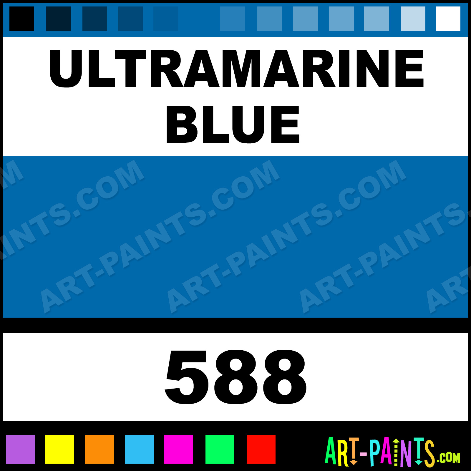 This beautiful Primary Airbrush shade is called Ultramarine Blue, and comes from a company called Chroma. Their product number, along with the HTML color code, RGB, and CMYK codes are listed below. This Beautiful Shade of Ultramarine Blue and others can be found in the Chroma Primary Art Spray Paint Gallery! Also be sure to browse through the other wonderful Professional Color Galleries to see more of Chroma Primary Airbrush Brand Spray Paints and other Spray Paint Manufacturers. And as always, Paint Paint Paint!   -Art-Paints.com