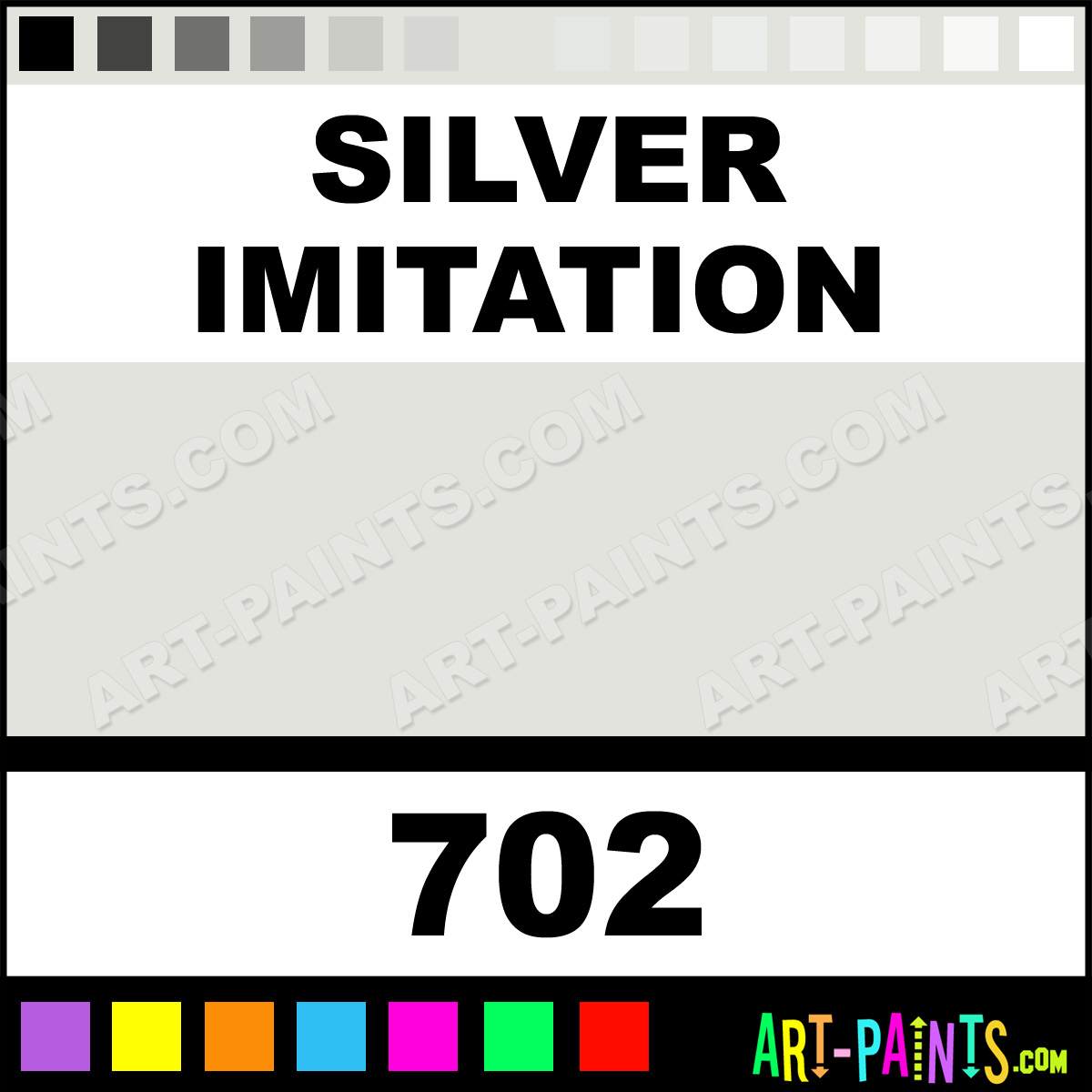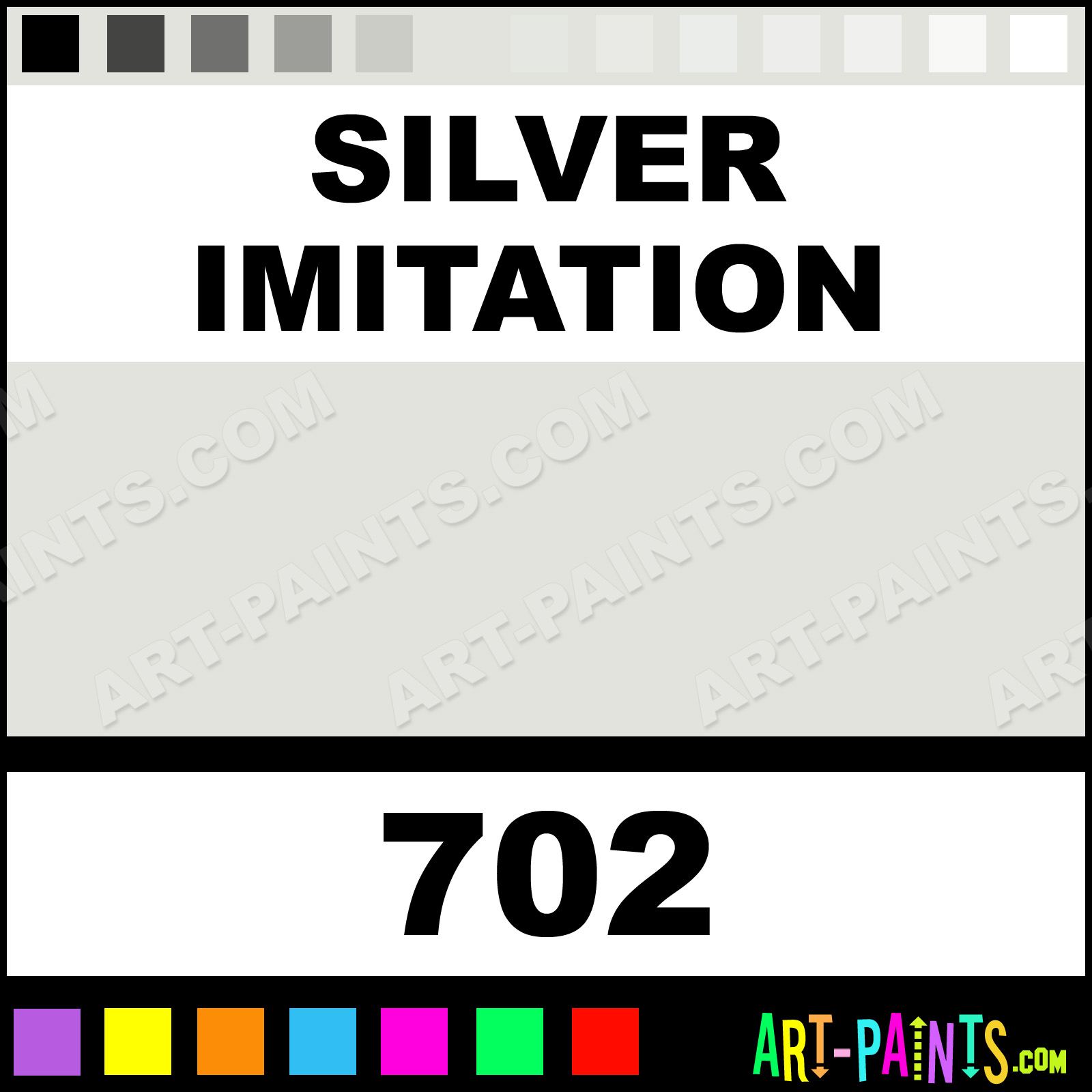 This beautiful FW Artists Airbrush shade is called Silver Imitation, and comes from a company called Daler Rowney. Their product number, along with the HTML color code, RGB, and CMYK codes are listed below. This Beautiful Shade of Silver Imitation and others can be found in the Daler Rowney FW Artists Art Spray Paint Gallery! Also be sure to browse through the other wonderful Professional Color Galleries to see more of Daler Rowney FW Artists Airbrush Brand Spray Paints and other Spray Paint Manufacturers. And as always, Paint Paint Paint!   -Art-Paints.com