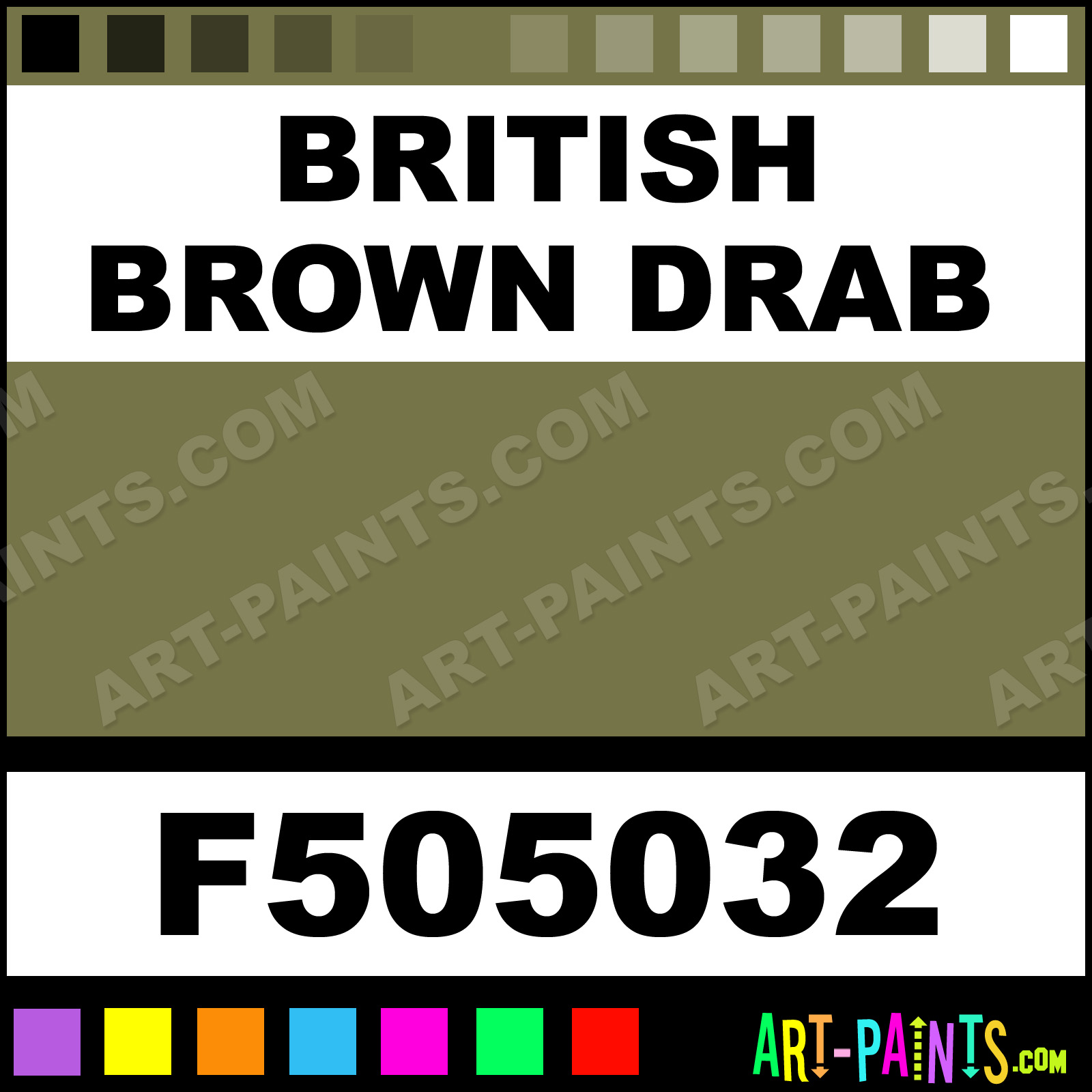 This beautiful Military Model Airbrush shade is called British Brown Drab, and comes from a company called Floquil. Their product number, along with the HTML color code, RGB, and CMYK codes are listed below. This Beautiful Shade of British Brown Drab and others can be found in the Floquil Military Model Art Spray Paint Gallery! Also be sure to browse through the other wonderful Professional Color Galleries to see more of Floquil Military Model Airbrush Brand Spray Paints and other Spray Paint Manufacturers. And as always, Paint Paint Paint!   -Art-Paints.com