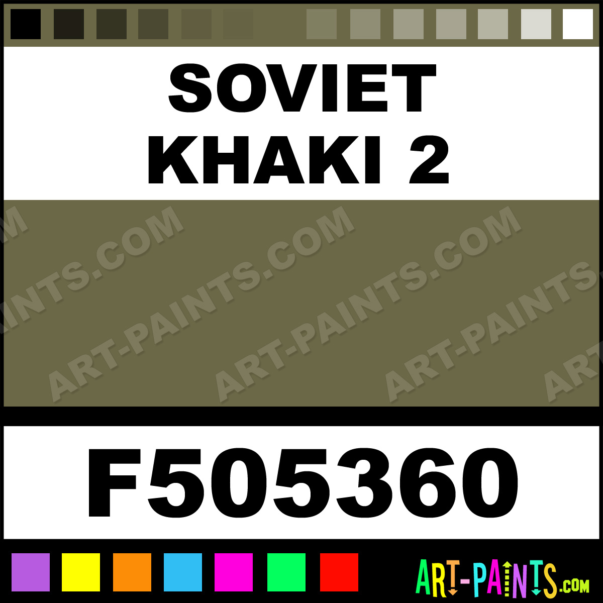 This beautiful Military Model Airbrush shade is called Soviet Khaki 2, and comes from a company called Floquil. Their product number, along with the HTML color code, RGB, and CMYK codes are listed below. This Beautiful Shade of Soviet Khaki 2 and others can be found in the Floquil Military Model Art Spray Paint Gallery! Also be sure to browse through the other wonderful Professional Color Galleries to see more of Floquil Military Model Airbrush Brand Spray Paints and other Spray Paint Manufacturers. And as always, Paint Paint Paint!   -Art-Paints.com