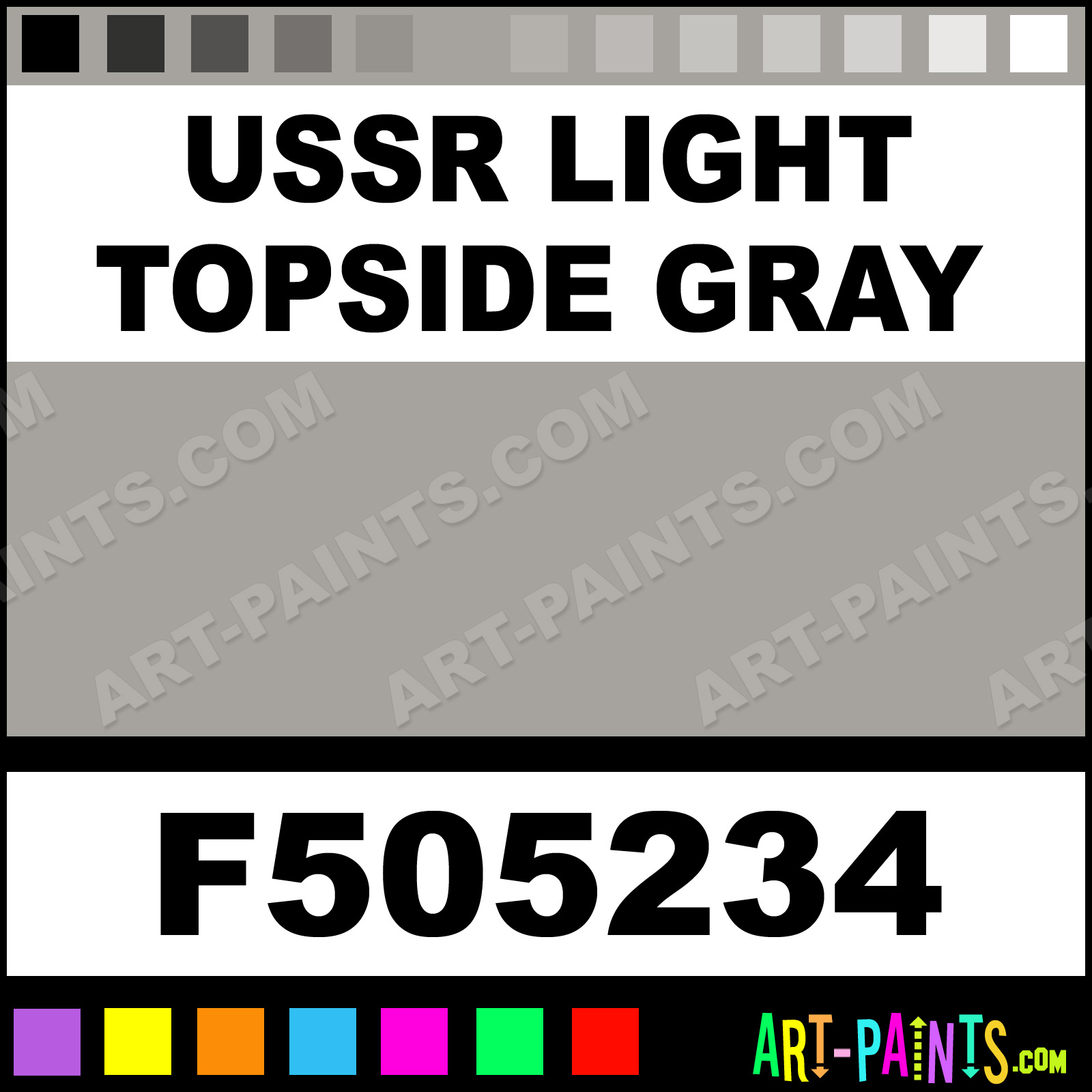This beautiful Military Model Airbrush shade is called USSR Light Topside Gray, and comes from a company called Floquil. Their product number, along with the HTML color code, RGB, and CMYK codes are listed below. This Beautiful Shade of USSR Light Topside Gray and others can be found in the Floquil Military Model Art Spray Paint Gallery! Also be sure to browse through the other wonderful Professional Color Galleries to see more of Floquil Military Model Airbrush Brand Spray Paints and other Spray Paint Manufacturers. And as always, Paint Paint Paint!   -Art-Paints.com