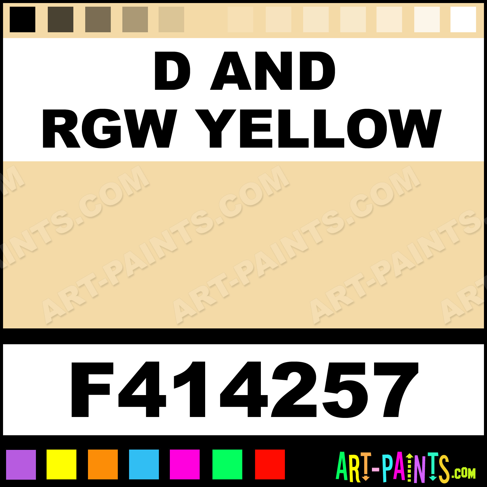 This beautiful Railroad Acrylics Airbrush shade is called D and RGW Yellow, and comes from a company called Floquil. Their product number, along with the HTML color code, RGB, and CMYK codes are listed below. This Beautiful Shade of D and RGW Yellow and others can be found in the Floquil Railroad Acrylics Art Spray Paint Gallery! Also be sure to browse through the other wonderful Professional Color Galleries to see more of Floquil Railroad Acrylics Airbrush Brand Spray Paints and other Spray Paint Manufacturers. And as always, Paint Paint Paint!   -Art-Paints.com