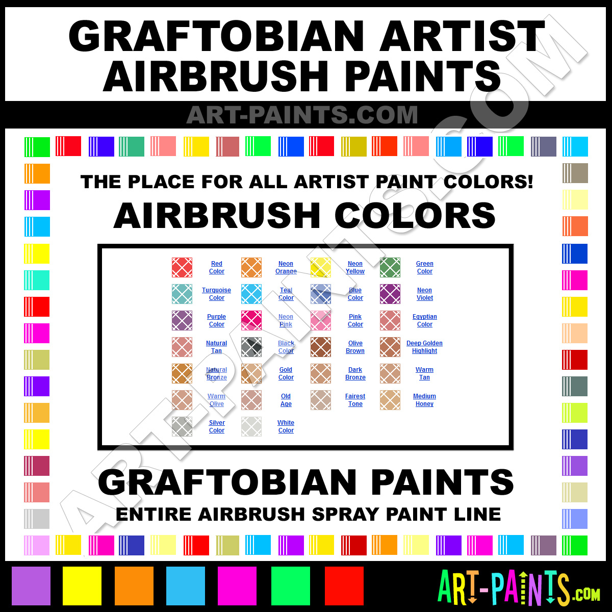Graftobian knows Airbrush Spray Paints! They make a wonderful brand of Spray Paint called Graftobian Artist Airbrush Colors that suits all types of artists. They strive to perfect the process of color and are one of the most popular Airbrush Spray Paint Brand companies in the world. Enjoy their entire Spray Paint brand collection from the list below. Graftobian makes wonderful Artists Paints that everyone is sure to enjoy! Choose an Airbrush Spray Paint Color below to view that Hue and all their great related Paint Colors. Paint on!     -Art-Paints.com