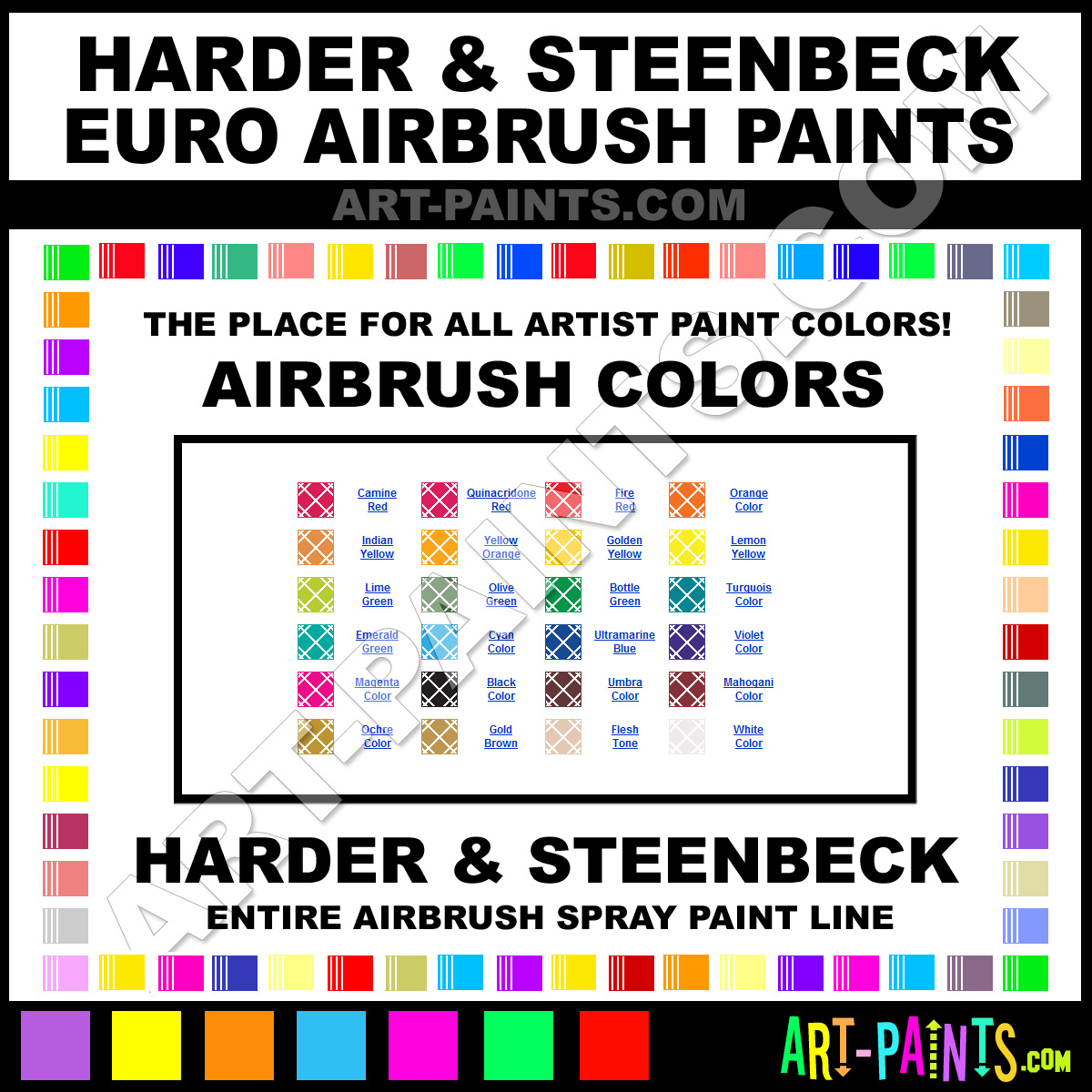Harder and Steenbeck knows Airbrush Spray Paints! They make a wonderful brand of paint called Harder and Steenbeck Euro Airbrush Colors that suits all types of artists. They strive to perfect the process of color and are one of the most popular Airbrush Spray Paint Brand companies in the world. Enjoy their entire paint brand collection from the list below. Harder and Steenbeck makes wonderful Artists Paints that everyone is sure to enjoy! Choose an Airbrush Spray Paint Color below to view that Hue and all their related Paint Colors.     -Art-Paints.com