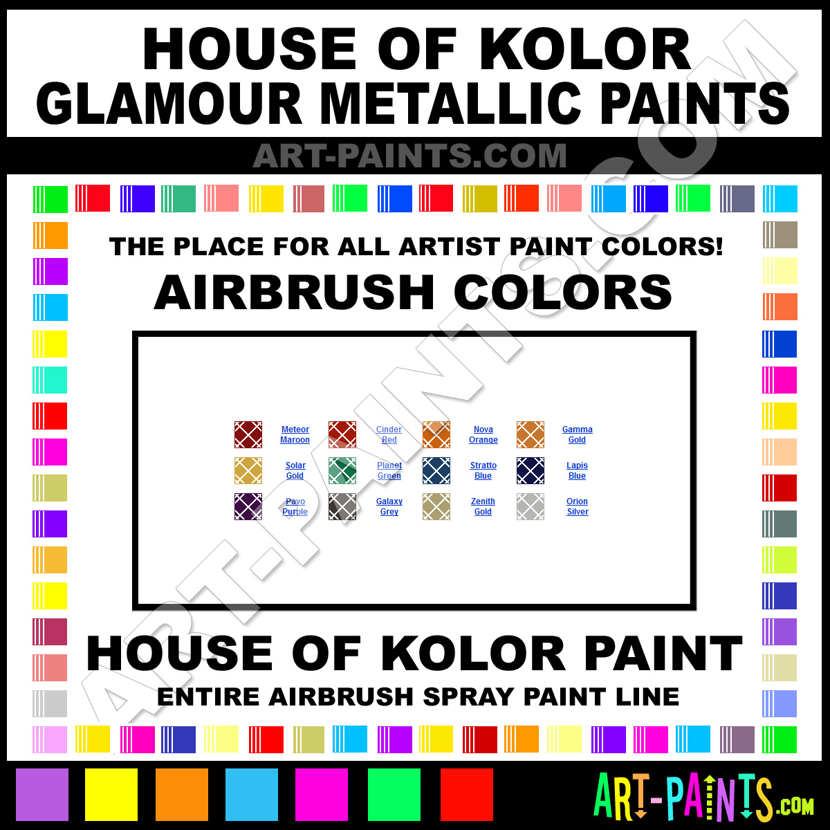House of Kolor makes a beautiful Glamour Metallics Spray Paint Brand. With a complete line of Airbrush Color Spray Paints, 12 colors in all, available in beautiful hues and colors, they will no doubt keep you painting and smiling at the same time. This brand is very unique and exquisite!