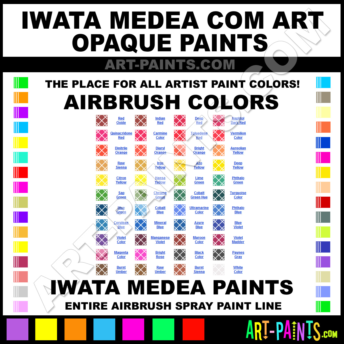 Iwata Medea knows Airbrush Spray Paints! They make a wonderful brand of paint called Iwata Medea Com Art Opaque Airbrush Colors that suits all types of artists. They strive to perfect the process of color and are one of the most popular Airbrush Spray Paint Brand companies in the world. Enjoy their entire paint brand collection from the list below. Iwata Medea makes wonderful Artists Paints that everyone is sure to enjoy! Choose an Airbrush Spray Paint Color below to view that Hue and all their great related Paint Colors. Paint on!     -Art-Paints.com