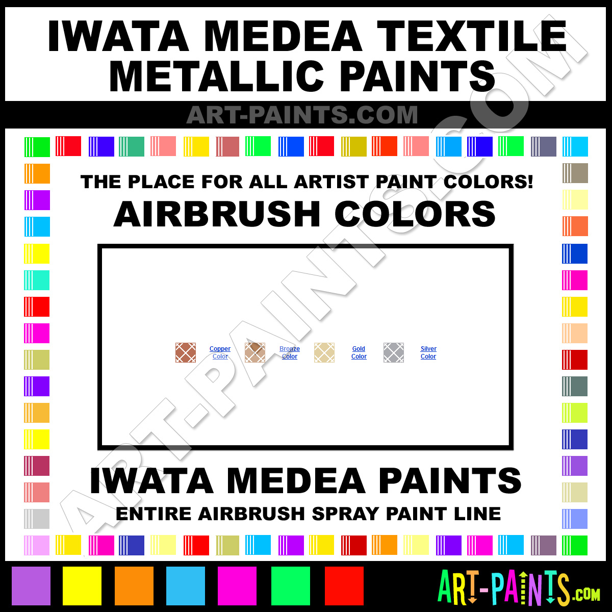 Iwata Medea knows Airbrush Spray Paints! They make a wonderful brand of paint called Iwata Medea Textile Metallic Airbrush Colors that suits all types of artists. They strive to perfect the process of color and are one of the most popular Airbrush Spray Paint Brand companies in the world. Enjoy their entire paint brand collection from the list below. Iwata Medea makes wonderful Artists Paints that everyone is sure to enjoy! Choose an Airbrush Spray Paint Color below to view that Hue and all their great related Paint Colors. Paint on!     -Art-Paints.com