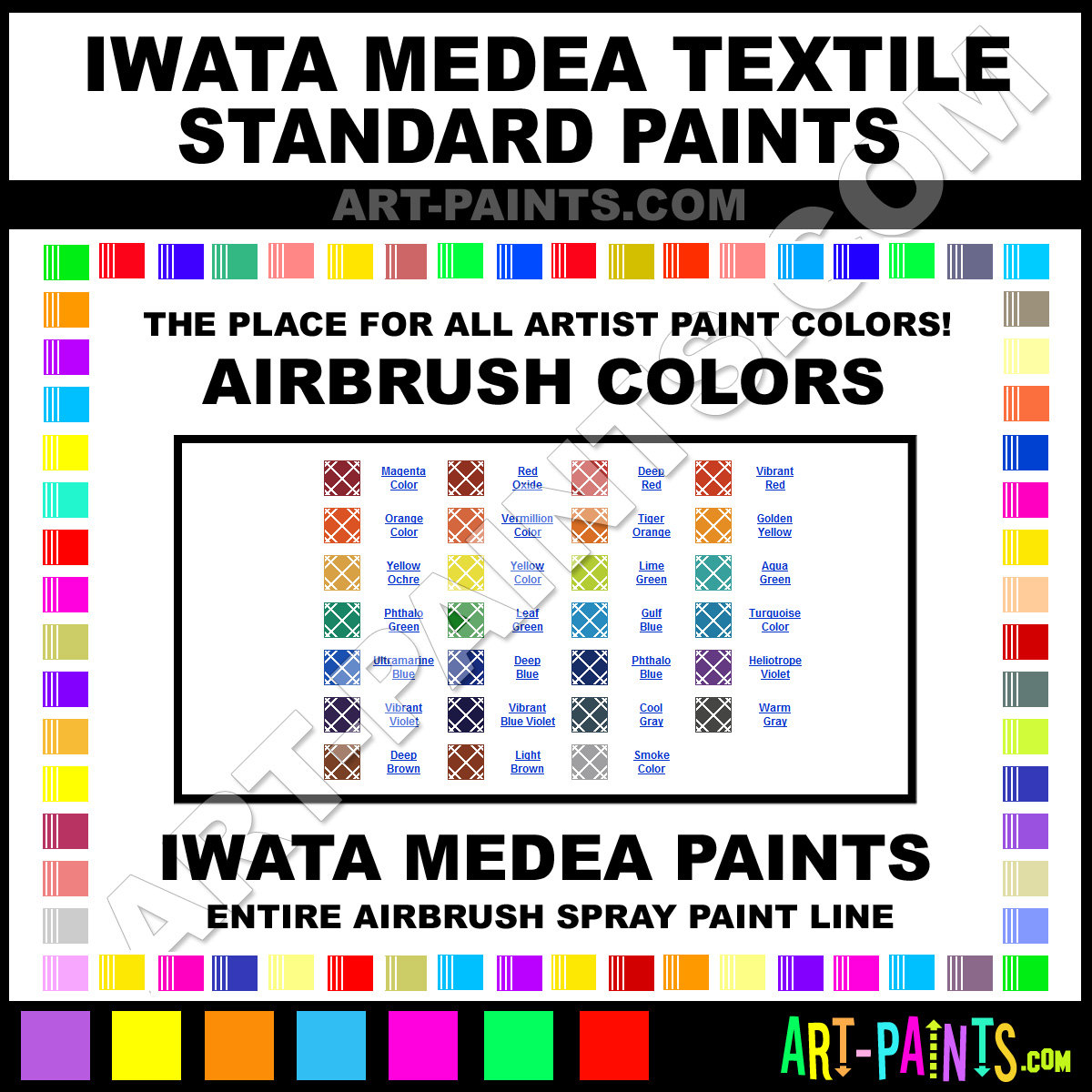 Iwata Medea knows Airbrush Spray Paints! They make a wonderful brand of paint called Iwata Medea Textile Standard Airbrush Colors that suits all types of artists. They strive to perfect the process of color and are one of the most popular Airbrush Spray Paint Brand companies in the world. Enjoy their entire paint brand collection from the list below. Iwata Medea makes wonderful Artists Paints that everyone is sure to enjoy! Choose an Airbrush Spray Paint Color below to view that Hue and all their great related Paint Colors. Paint on!     -Art-Paints.com