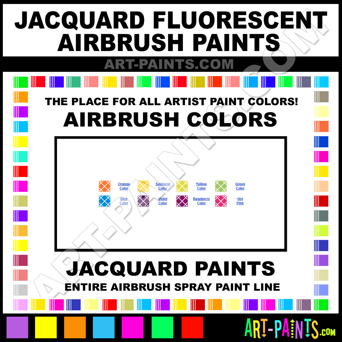 Jacquard knows Airbrush Spray Paints! They make a wonderful brand of paint called Jacquard Fluorescent Airbrush Colors that suits all types of artists. They strive to perfect the process of color and are one of the most popular Airbrush Spray Paint Brand companies in the world. Enjoy their entire paint brand collection from the list below. Jacquard makes wonderful Artists Paints that everyone is sure to enjoy! Choose an Airbrush Spray Paint Color below to view that Hue and all their great related Paint Colors. Paint on!     -Art-Paints.com