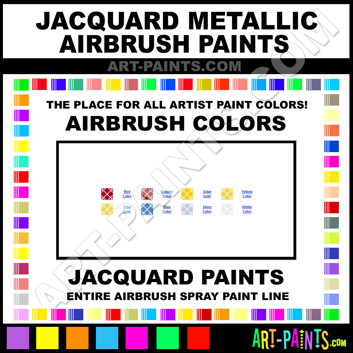 Jacquard knows Airbrush Spray Paints! They make a wonderful brand of paint called Jacquard Metallic Airbrush Colors that suits all types of artists. They strive to perfect the process of color and are one of the most popular Airbrush Spray Paint Brand companies in the world. Enjoy their entire paint brand collection from the list below. Jacquard makes wonderful Artists Paints that everyone is sure to enjoy! Choose an Airbrush Spray Paint Color below to view that Hue and all their great related Paint Colors. Paint on!     -Art-Paints.com