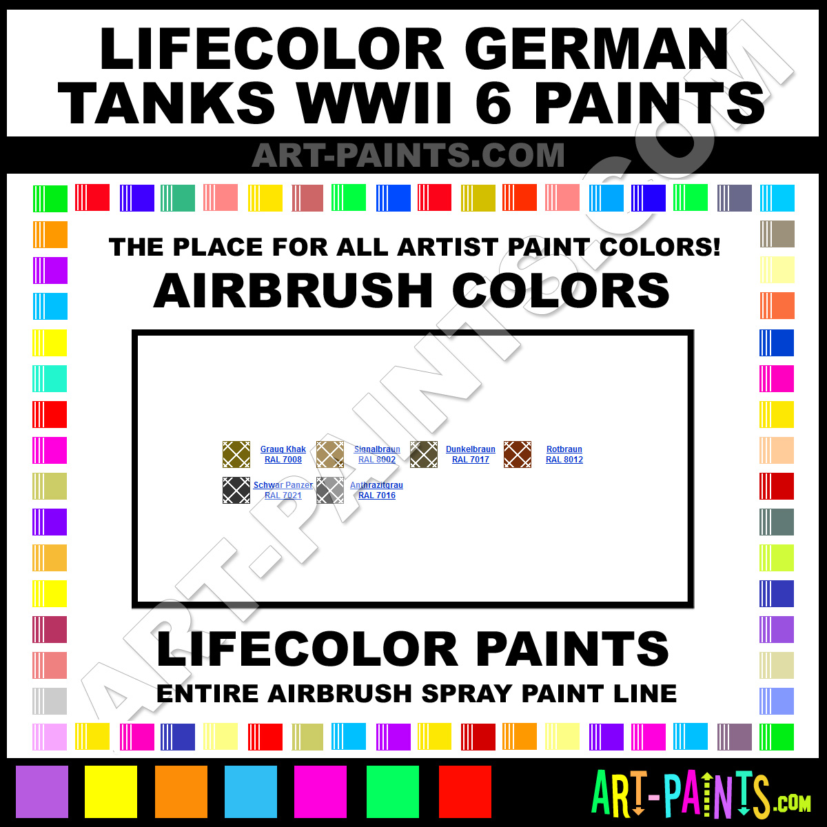 Lifecolor knows Airbrush Spray Paints! They make a wonderful brand of paint called Lifecolor German Tanks WWII 6 Airbrush Colors that suits all types of artists. They strive to perfect the process of color and are one of the most popular Airbrush Spray Paint Brand companies in the world. Enjoy their entire paint brand collection from the list below. Lifecolor makes wonderful Artists Paints that everyone is sure to enjoy! Choose an Airbrush Spray Paint Color below to view that Hue and all their great related Paint Colors. Paint on!     -Art-Paints.com