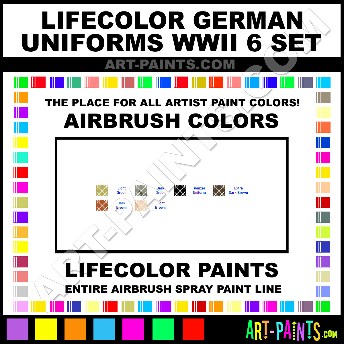 Lifecolor knows Airbrush Spray Paints! They make a wonderful brand of paint called Lifecolor German Uniforms WWII 6 Airbrush Colors that suits all types of artists. They strive to perfect the process of color and are one of the most popular Airbrush Spray Paint Brand companies in the world. Enjoy their entire paint brand collection from the list below. Lifecolor makes wonderful Artists Paints that everyone is sure to enjoy! Choose an Airbrush Spray Paint Color below to view that Hue and all their great related Paint Colors. Paint on!     -Art-Paints.com