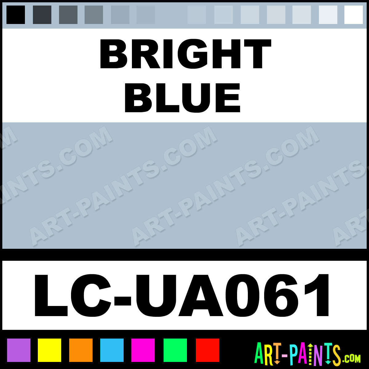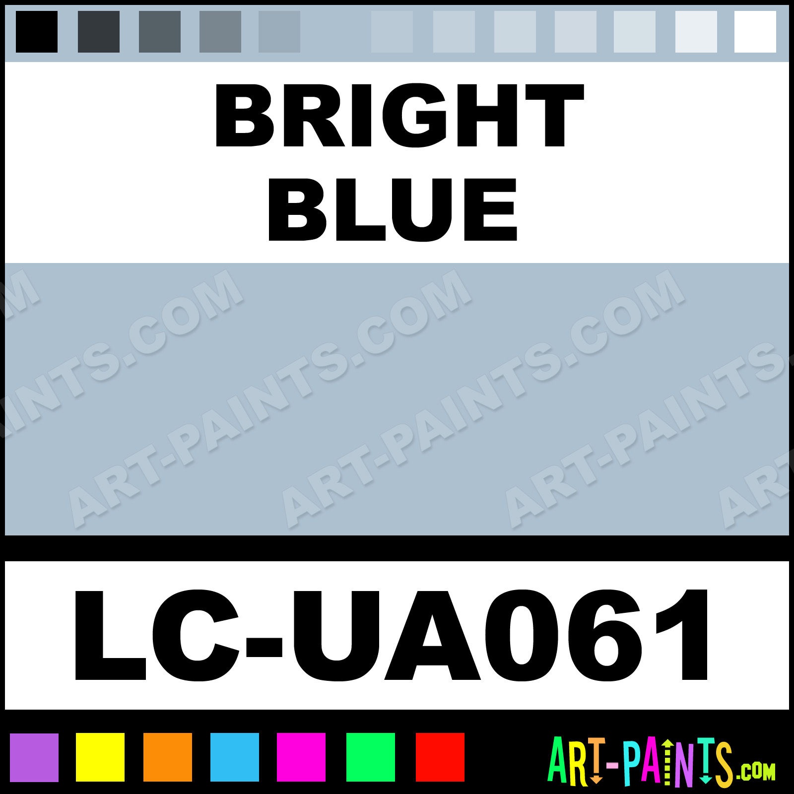 This beautiful UA Mimetic Airbrush shade is called Bright Blue, and comes from a company called Lifecolor. Their product number, along with the HTML color code, RGB, and CMYK codes are listed below. This Beautiful Shade of Bright Blue and others can be found in the Lifecolor UA Mimetic Art Spray Paint Gallery! Also be sure to browse through the other wonderful Professional Color Galleries to see more of Lifecolor UA Mimetic Airbrush Brand Spray Paints and other Spray Paint Manufacturers. And as always, Paint Paint Paint!   -Art-Paints.com