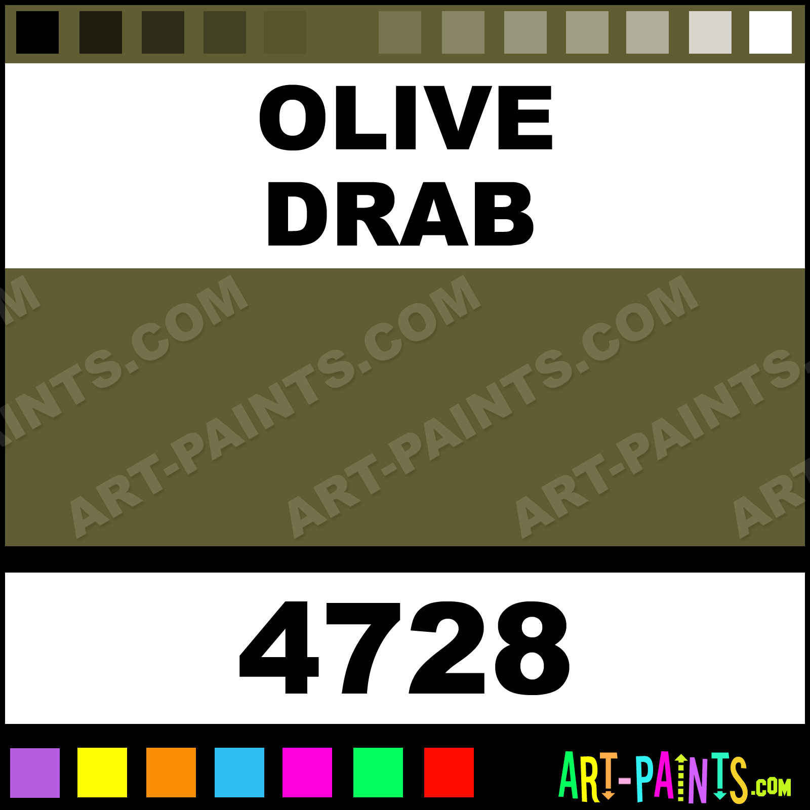 This beautiful Artist Airbrush shade is called Olive Drab, and comes from a company called Model Master. Their product number, along with the HTML color code, RGB, and CMYK codes are listed below. This Beautiful Shade of Olive Drab and others can be found in the Model Master Artist Art Spray Paint Gallery! Also be sure to browse through the other wonderful Professional Color Galleries to see more of Model Master Artist Airbrush Brand Spray Paints and other Spray Paint Manufacturers. And as always, Paint Paint Paint!   -Art-Paints.com