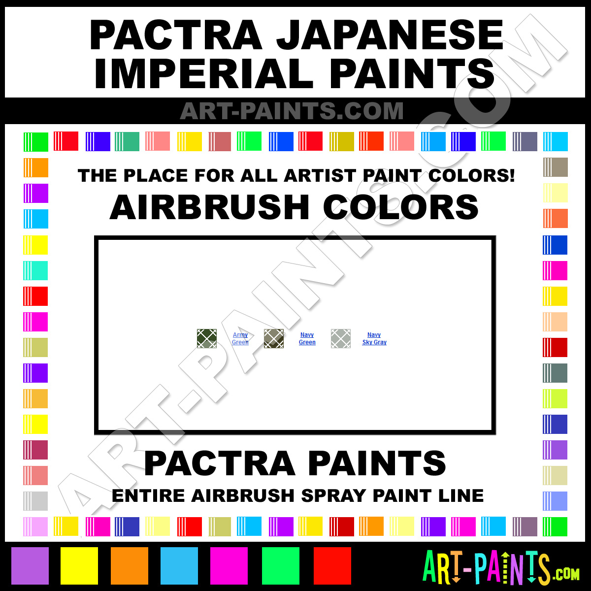 Pactra knows Airbrush Spray Paints! They make a wonderful brand of paint called Pactra Japanese Imperial Airbrush Colors that suits all types of artists. They strive to perfect the process of color and are one of the most popular Airbrush Spray Paint Brand companies in the world. Enjoy their entire paint brand collection from the list below. Pactra makes wonderful Artists Paints that everyone is sure to enjoy! Choose an Airbrush Spray Paint Color below to view that Hue and all their great related Paint Colors. Paint on!     -Art-Paints.com