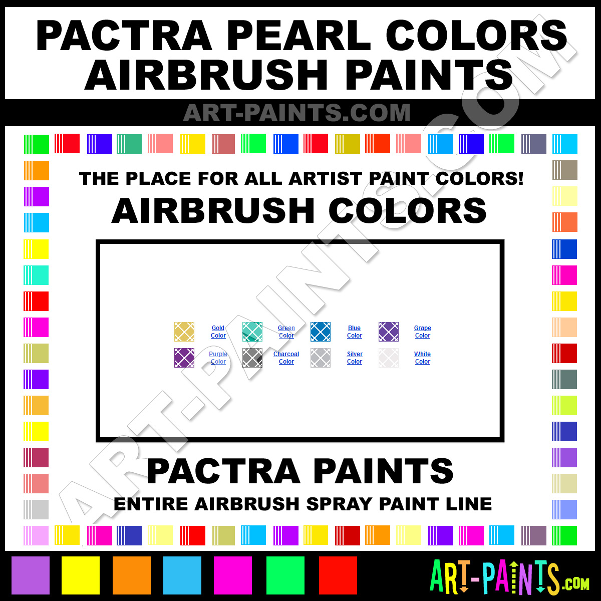 Pactra knows Airbrush Spray Paints! They make a wonderful brand of paint called Pactra Pearl Colors Airbrush Colors that suits all types of artists. They strive to perfect the process of color and are one of the most popular Airbrush Spray Paint Brand companies in the world. Enjoy their entire paint brand collection from the list below. Pactra makes wonderful Artists Paints that everyone is sure to enjoy! Choose an Airbrush Spray Paint Color below to view that Hue and all their great related Paint Colors. Paint on!     -Art-Paints.com