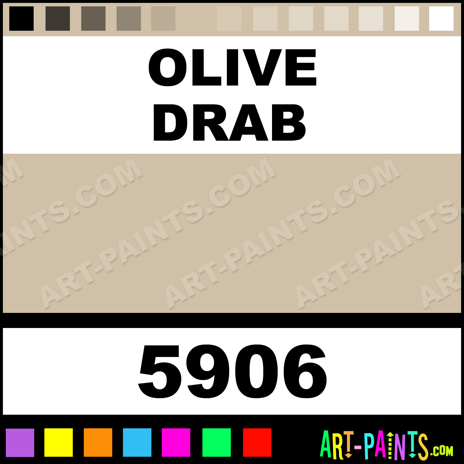 This beautiful Racing Finish Airbrush shade is called Olive Drab, and comes from a company called Pactra. Their product number, along with the HTML color code, RGB, and CMYK codes are listed below. This Beautiful Shade of Olive Drab and others can be found in the Pactra Racing Finish Art Spray Paint Gallery! Also be sure to browse through the other wonderful Professional Color Galleries to see more of Pactra Racing Finish Airbrush Brand Spray Paints and other Spray Paint Manufacturers. And as always, Paint Paint Paint!   -Art-Paints.com