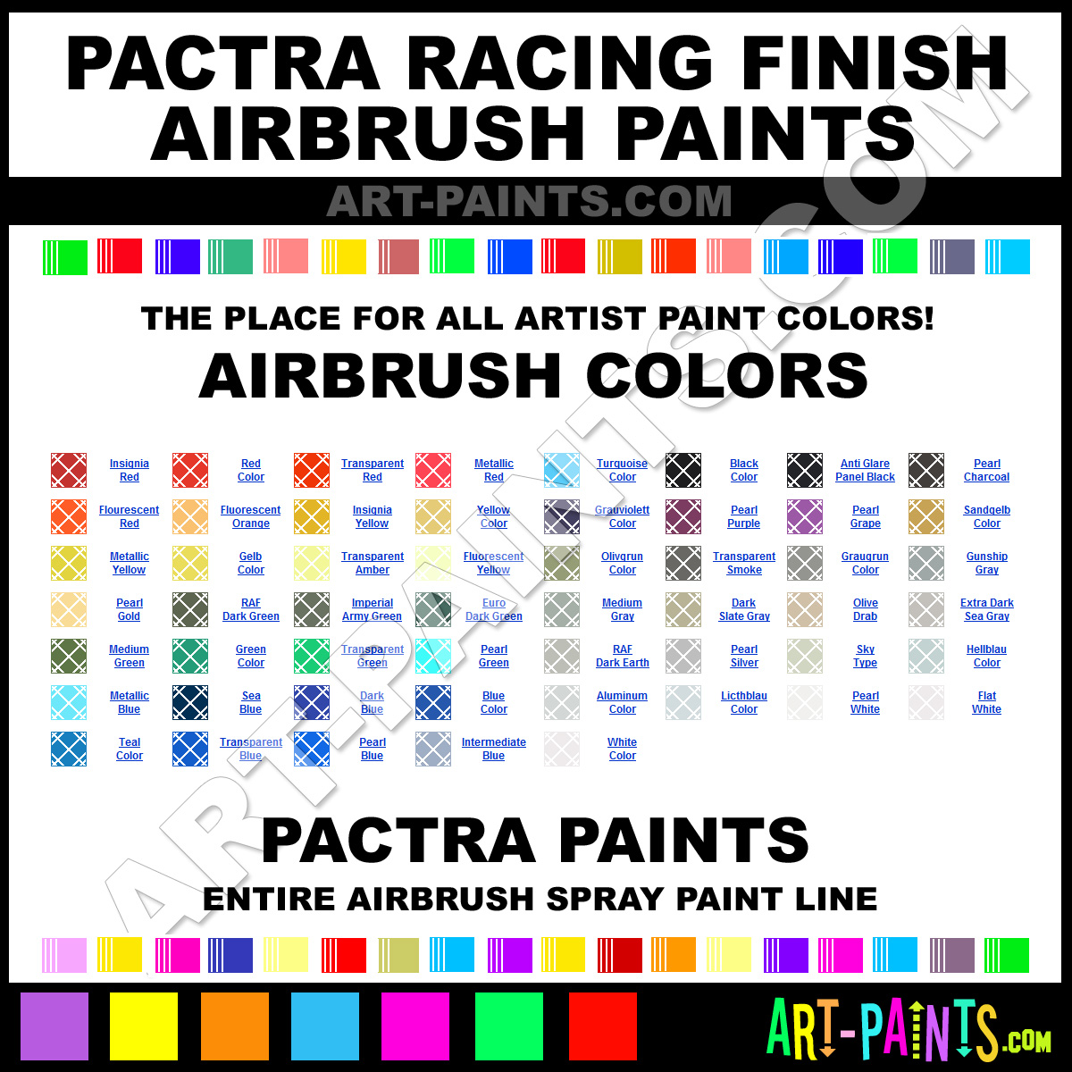 Pactra knows Airbrush Spray Paints! They make a wonderful brand of paint called Pactra Racing Finish Airbrush Colors that suits all types of artists. They strive to perfect the process of color and are one of the most popular Airbrush Spray Paint Brand companies in the world. Enjoy their entire paint brand collection from the list below. Pactra makes wonderful Artists Paints that everyone is sure to enjoy! Choose an Airbrush Spray Paint Color below to view that Hue and all their great related Paint Colors. Paint on!     -Art-Paints.com
