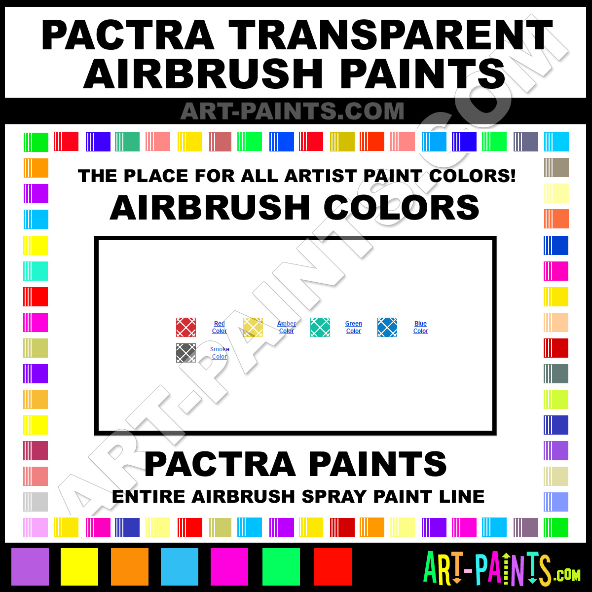 Pactra knows Airbrush Spray Paints! They make a wonderful brand of paint called Pactra Transparent Airbrush Colors that suits all types of artists. They strive to perfect the process of color and are one of the most popular Airbrush Spray Paint Brand companies in the world. Enjoy their entire paint brand collection from the list below. Pactra makes wonderful Artists Paints that everyone is sure to enjoy! Choose an Airbrush Spray Paint Color below to view that Hue and all their great related Paint Colors. Paint on!     -Art-Paints.com
