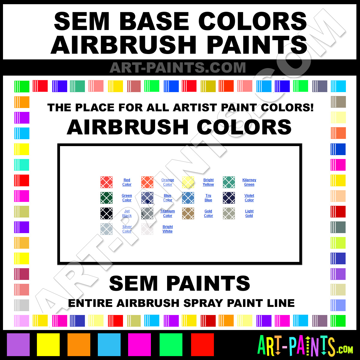 SEM makes a beautiful Base Colors Spray Paint Brand. With a complete line of Airbrush Color Spray Paints, 14 colors in all, available in beautiful hues and colors, they will no doubt keep you painting and smiling at the same time. This brand is very unique and exquisite!