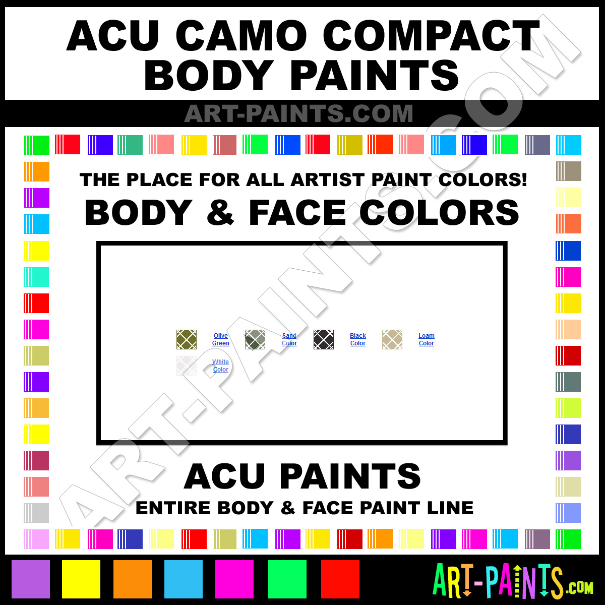 ACU knows Body and Face Paints! They make a wonderful brand of paint called ACU Camo Compact Body Colors that suits all types of artists, whether they deal with Face Makeup, Body Paints, Stage and Theater Paint or even Clown Paints! They strive to perfect the process of color and are one of the most popular Body Paint Brand companies in the world. Enjoy their entire paint brand collection from the list below. ACU makes wonderful Artists Body and Face Paints that everyone is sure to enjoy! Choose an Body Paint Color below to view that Hue and all their great related color paints. Paint on!     -Art-Paints.com