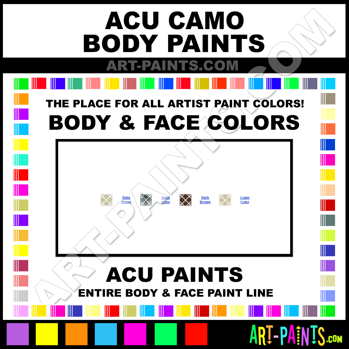 ACU knows Body and Face Paints! They make a wonderful brand of paint called ACU Camo Paint Body Colors that suits all types of artists, whether they deal with Face Makeup, Body Paints, Stage and Theater Paint or even Clown Paints! They strive to perfect the process of color and are one of the most popular Body Paint Brand companies in the world. Enjoy their entire paint brand collection from the list below. ACU makes wonderful Artists Body and Face Paints that everyone is sure to enjoy! Choose an Body Paint Color below to view that Hue and all their great related color paints. Paint on!     -Art-Paints.com