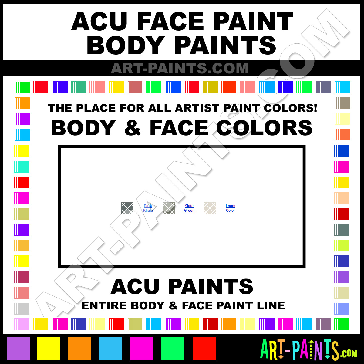 ACU knows Body and Face Paints! They make a wonderful brand of paint called ACU Face Paint Body Colors that suits all types of artists, whether they deal with Face Makeup, Body Paints, Stage and Theater Paint or even Clown Paints! They strive to perfect the process of color and are one of the most popular Body Paint Brand companies in the world. Enjoy their entire paint brand collection from the list below. ACU makes wonderful Artists Body and Face Paints that everyone is sure to enjoy! Choose an Body Paint Color below to view that Hue and all their great related color paints. Paint on!     -Art-Paints.com
