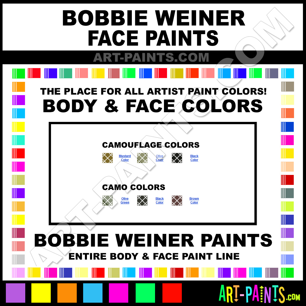 Bobbie Weiner knows Body and Face Paints! They make wonderful brands of paint for all types of artists. They strive to perfect the process of color and are one of the most popular Body Paint Brand companies in the world. Enjoy their entire brand collection from the list below. Bobbie Weiner makes a couple different types of Face and Body Paint Brands including its Camo Face Paint Paints and its Camouflage Face Paint Paints! Choose an Body Paint type below to view that brand and all the related Color Paints, Hues for any Stage, Theatre, Make-Up, or Clown use. Paint on!     -Art-Paints.com