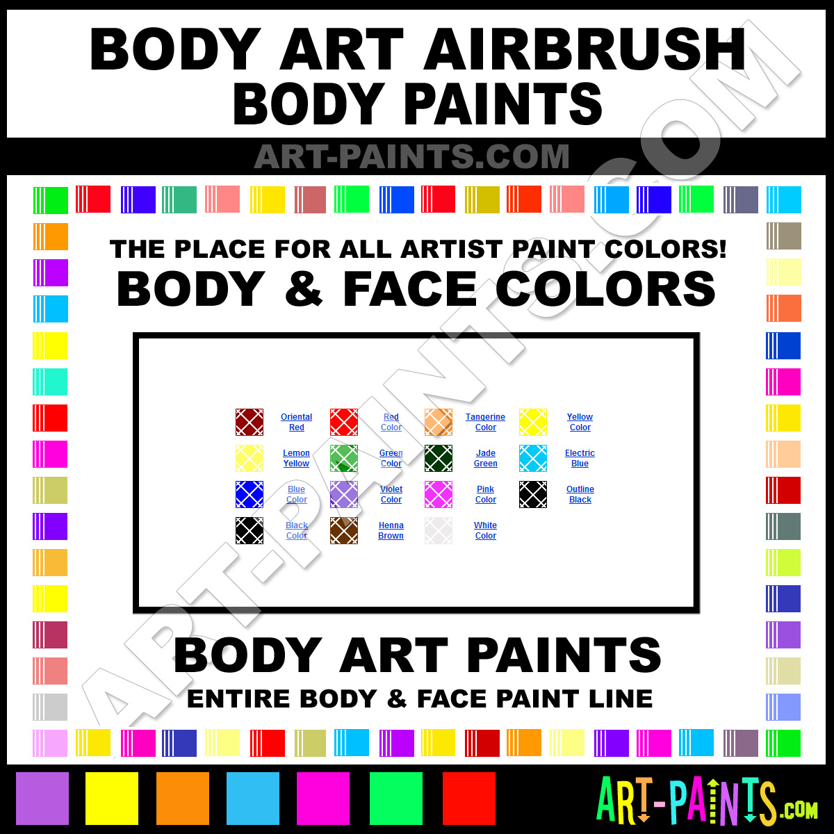 Body Art knows Body and Face Paints! They make a wonderful brand of paint called Body Art Airbrush Body Colors that suits all types of artists, whether they deal with Face Makeup, Body Paints, Stage and Theater Paint or even Clown Paints! They strive to perfect the process of color and are one of the most popular Body Paint Brand companies in the world. Enjoy their entire paint brand collection from the list below. Body Art makes wonderful Artists Body and Face Paints that everyone is sure to enjoy! Choose an Body Paint Color below to view that Hue and all their great related color paints. Paint on!     -Art-Paints.com