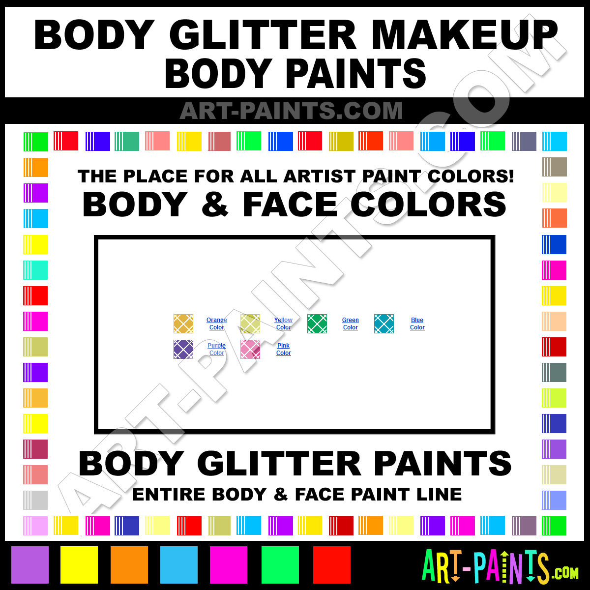Body Glitter knows Body and Face Paints! They make a wonderful brand of paint called Body Glitter Makeup Body Colors that suits all types of artists, whether they deal with Face Makeup, Body Paints, Stage and Theater Paint or even Clown Paints! They strive to perfect the process of color and are one of the most popular Body Paint Brand companies in the world. Enjoy their entire paint brand collection from the list below. Body Glitter makes wonderful Artists Body and Face Paints that everyone is sure to enjoy! Choose an Body Paint Color below to view that Hue and all their great related color paints. Paint on!     -Art-Paints.com